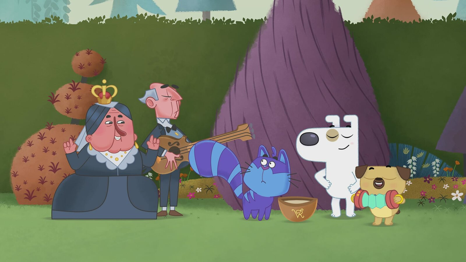 Die Geschichte vom Rätseln und SpielenMit einem Schälchen Sahne und guter Musik lässt sich die Grinsekatze anlocken.Bild: © KiKA/Dog Loves Productions Limited 2020