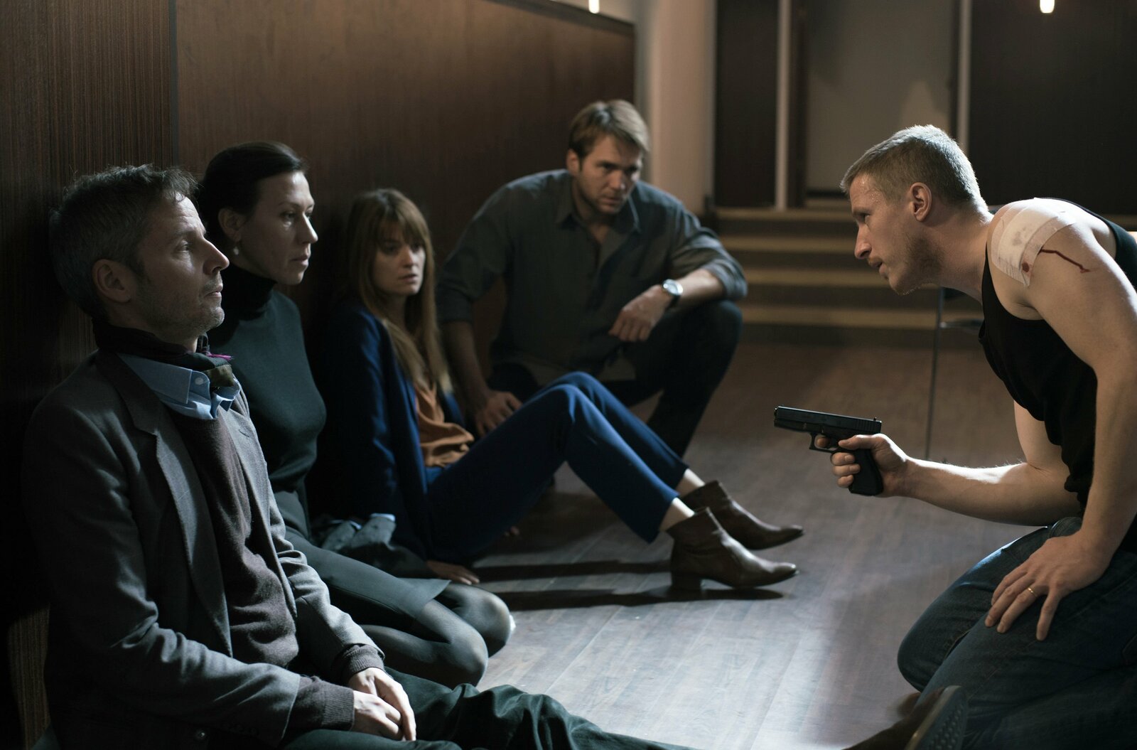 Borchert und die tödliche FalleAlexander Böni (Golo Euler) hat den Staatsanwalt Dr. Kugler (Matthias Bundschuh, v. l. n. r.), die Richterin Mildenberger (Kathleen Gallego Zapata), seine Anwältin Dominique (Ina Paule Klink) und Hauptmann Furrer (Pierre Kiwitt) als Geisel in seiner Gewalt.Bild: © ARD Degeto / Roland Suso Richter