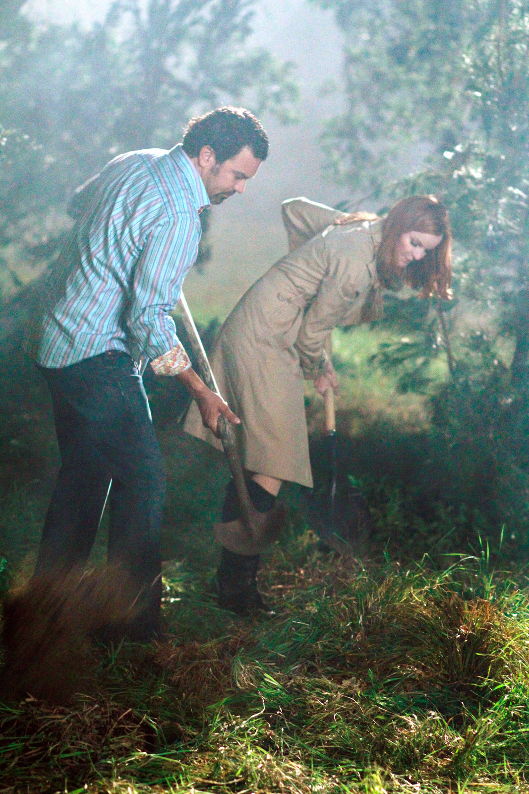 Das GeständnisWährend sich Lynette (Felicity Huffman), Gabrielle, Bree, Edie, Susan und die anderen Frauen auf die Modenschau vorbereiten, vergräbt Paul Young Mrs. Hubers Leiche in einem nahegelegenen Waldstück ...Bild: © Touchstone Pictures Lizenzbild frei