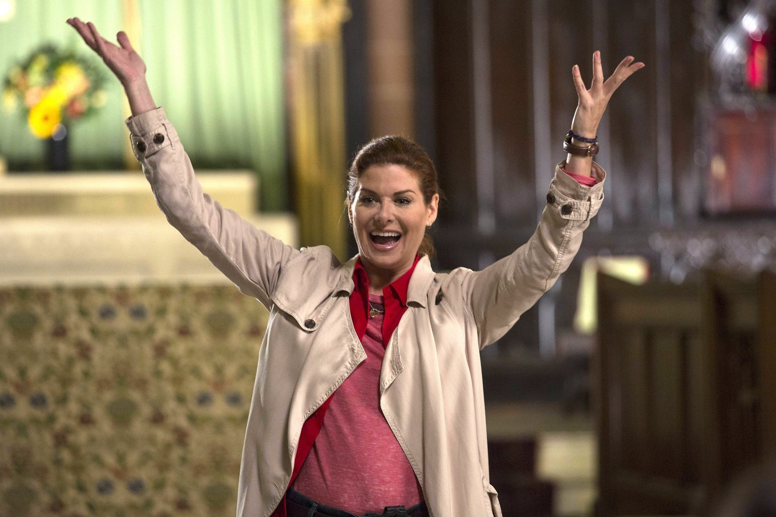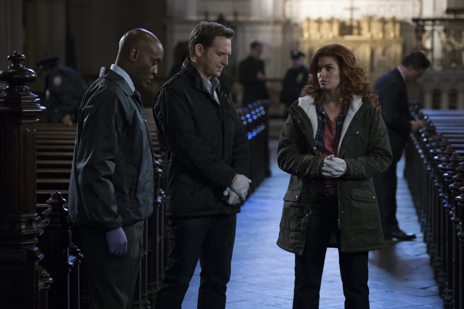 Laura und die DreierbeziehungReynaldo (Marc Webster, l.), Jake (Josh Lucas, M.) und Laura (Debra Messing, r.) werden zu einer Kirche gerufen, wo ein experimentierfreudiger Kunst-Fotograf einen gewaltsamen Tod gestorben ist ...Bild: © 2015 Warner Bros. Entertainment, Inc. Lizenzbild frei