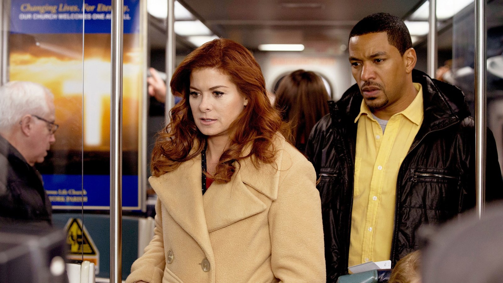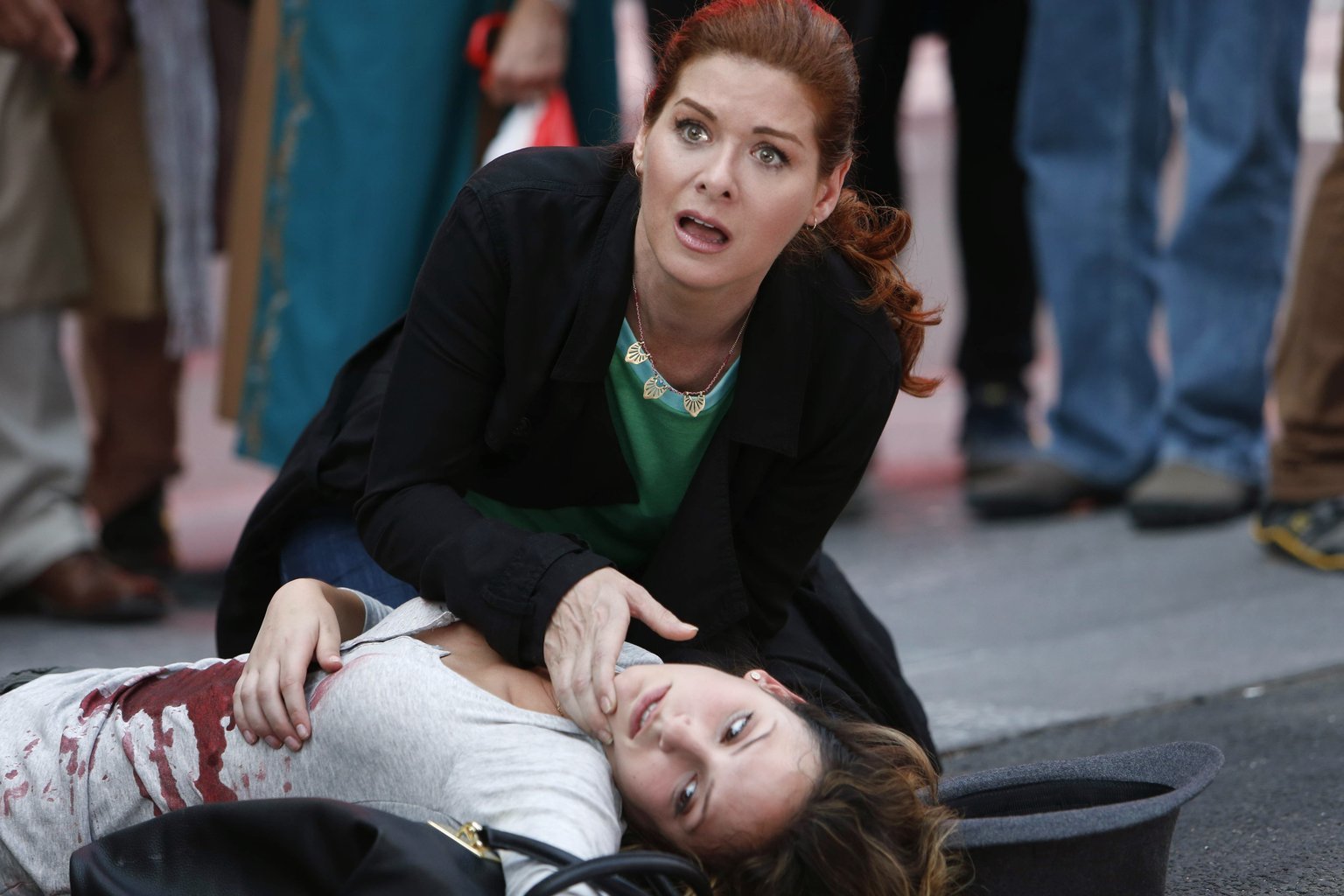 Laura und der SexskandalAls eine beschattete Person (Dillan Arrick, unten) auf offener Straße erschossen wird, müssen Laura (Debra Messing, oben) und ihre Kollegen schnell handeln, um den Mörder zu fassen ...Bild: © Warner Bros. Entertainment, Inc. Lizenzbild frei