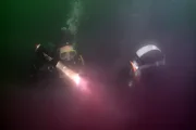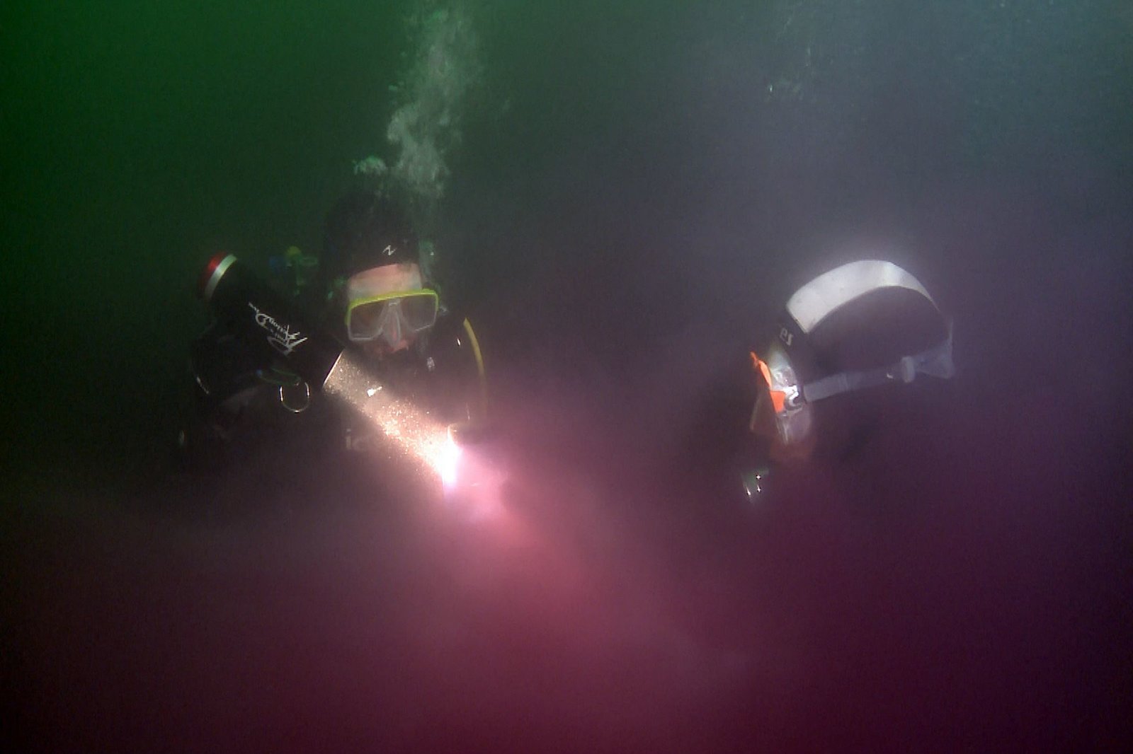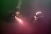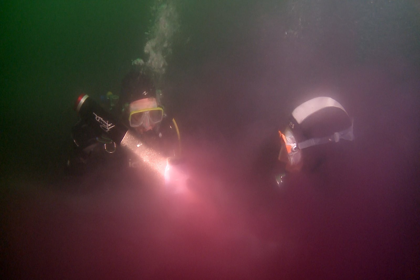 Von Mittenwald ins AllgäuForscher untersuchen die Purpurschicht im "Blutenden See", dem Alatsee bei Füssen. Hochtoxische Schwefelbakterien bilden in der Tiefe eine purpurne Giftwolke. Die Taucher dürfen sich nur wenige Minuten hier aufhalten.Bild: © SWR/SWR/Vidicom