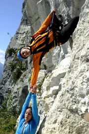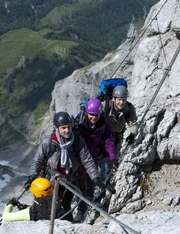 Goldrausch - Teil 2Andreas (Martin Gruber, l.), Tobias (Markus Brandl, r.) und Toni (Martin Klempnow, M.) seilen sich zu einer verunglückten Frau ab.Bild: © ZDF und Thomas R. Schumann