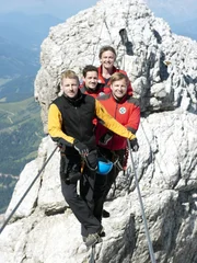 Tödliche Abgründe - Teil 1Mit Hilfe der Bergführerin Sabine (Susan Hoecke, 2. von hinten) machen sich Jan (Leander Lichti, 2.von vorne) und Paul (Mirko Lang, hinten) und Tanja (Nina Gnädig, vorne) auf einen mühsamen Weg.Bild: © ZDF und Thomas R. Schumann