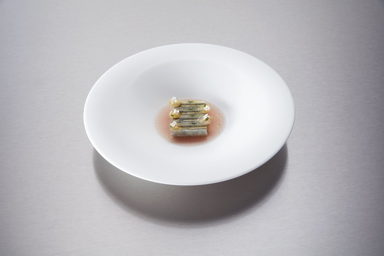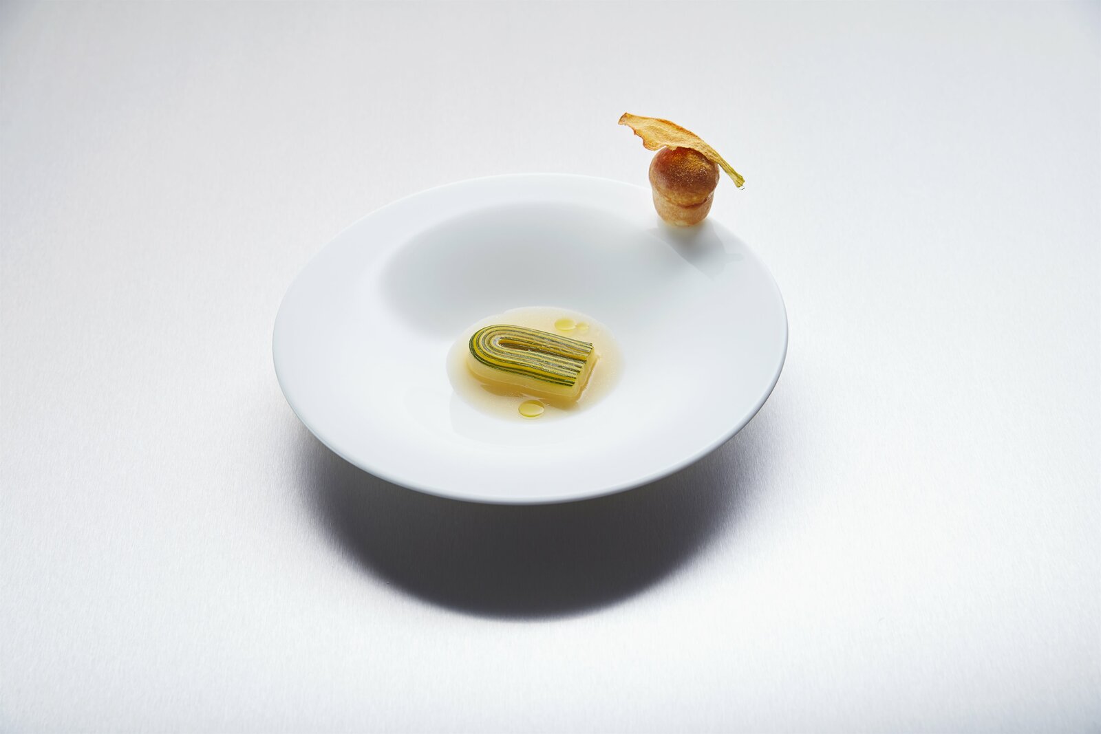 Mingoo KangMingoo Kang, guest chef April 2018, food, Restaurant Ikarus, Hangar-7, Salzburg, Austria, 2018.04.01, Zucchini “Seon“, rice cake, dried anchovy / Mingoo Kang, Gastkoch April 2018, Gericht, Restaurant Ikarus, Hangar-7, Salzburg, Österreich, 2018.04.01, Zucchini Seon, Reiscake, getrocknete AnchovisBild: © BonGusto