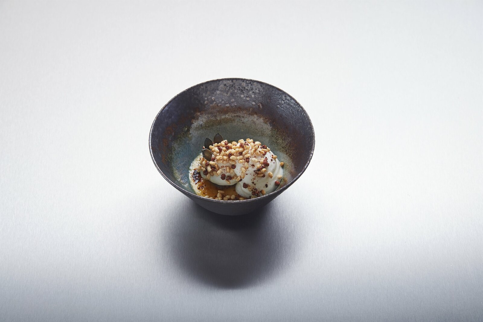 Mingoo KangMingoo Kang, guest chef April 2018, food, Restaurant Ikarus, Hangar-7, Salzburg, Austria, 2018.04.01, „Jang Trio“, “Doen Jang“ créme brúleé, vanilla , “Gochu jang“ puffed grains / Mingoo Kang, Gastkoch April 2018, Gericht, Restaurant Ikarus, Hangar-7, Salzburg, Österreich, 2018.04.01, Jang Trio, doeng Jang Creme Brúleé, Vanille, Gochu jang gepufftes GetreideBild: © BonGusto