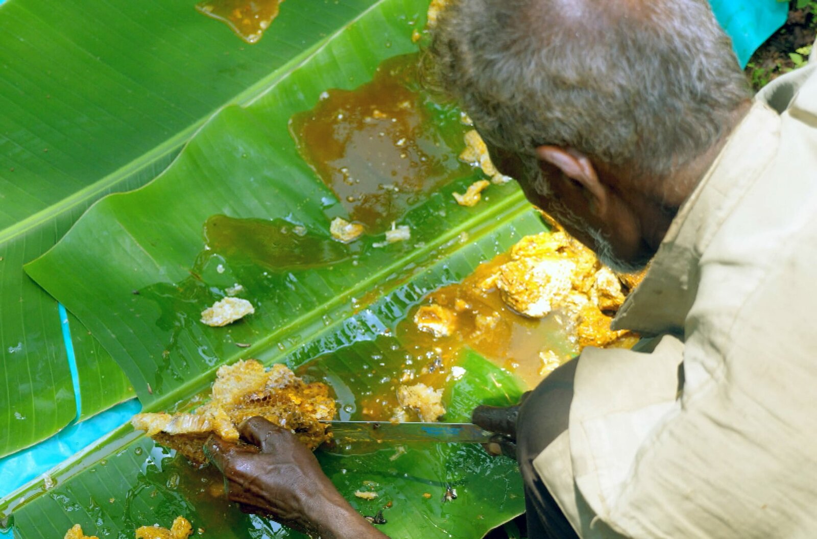 Indien - Flüssiges Gold in schwindelnder HöheChinasami und die anderen Männer teilen die Beute der Honigjagd unter sich auf. Dieses Jahr ist der Ertrag nur sehr gering ausgefallen: Die Bienen haben viel weniger Honig produziert als sonst.Bild: © arte