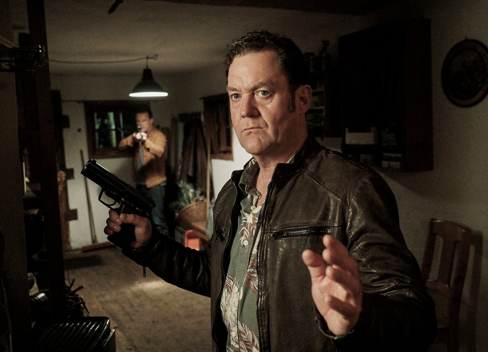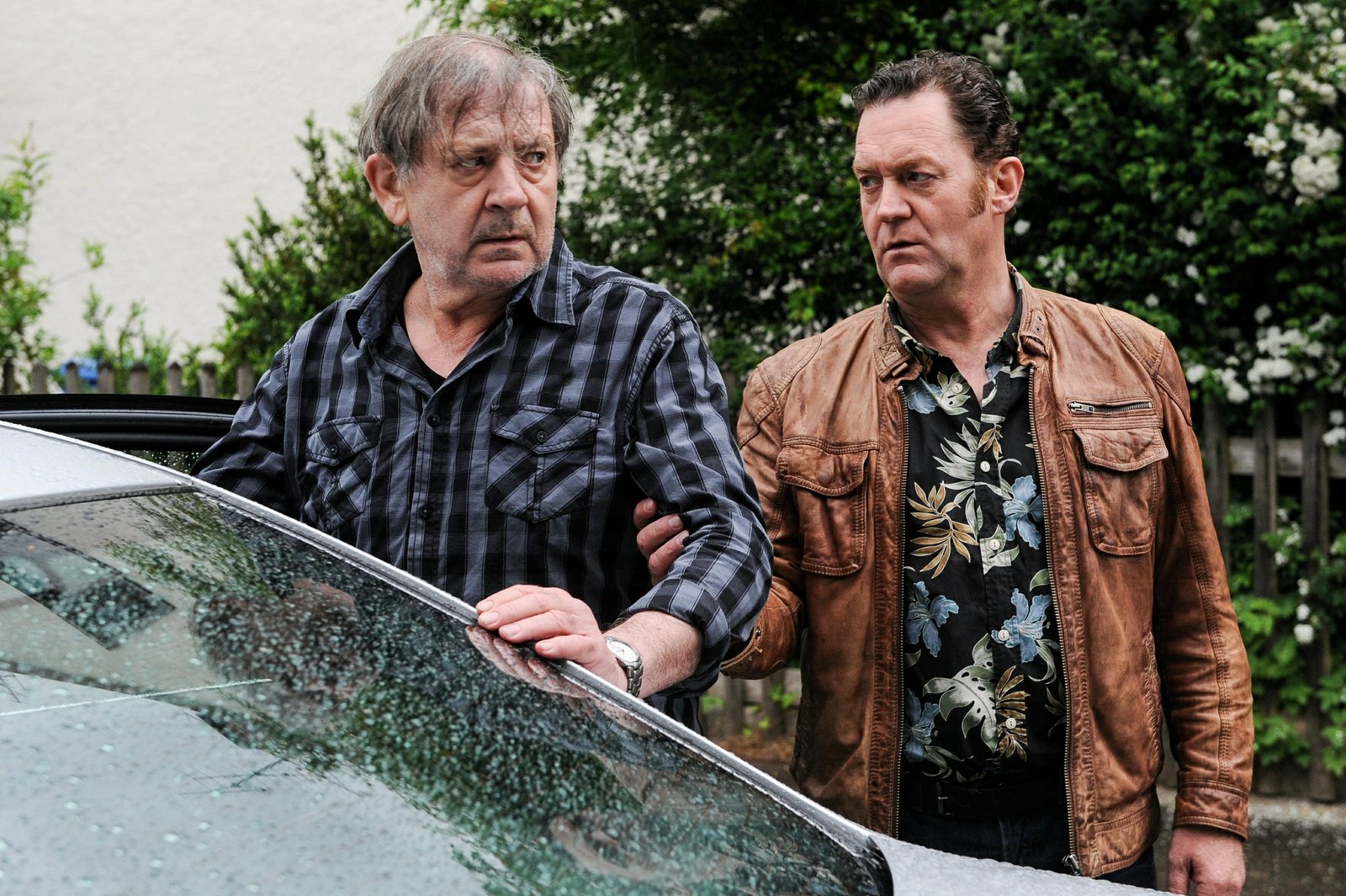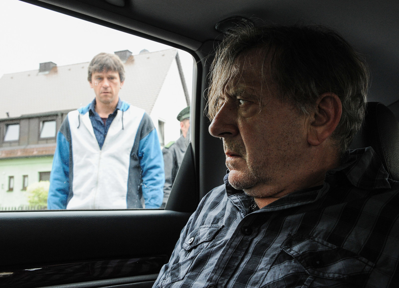 FamilienlöscherBenno Wiese (André Jung, l.) wird von Paul Böhmer (Jürgen Tonkel, r.) wieder nach Hause entlassen. In der Nachbarschaft wird er mit Hassrufen und Drohungen begrüßt. in Verbindung mit der Sendung bei Nennung ZDF/Michael MarhofferBild: © ZDF/Michael Marhoffer