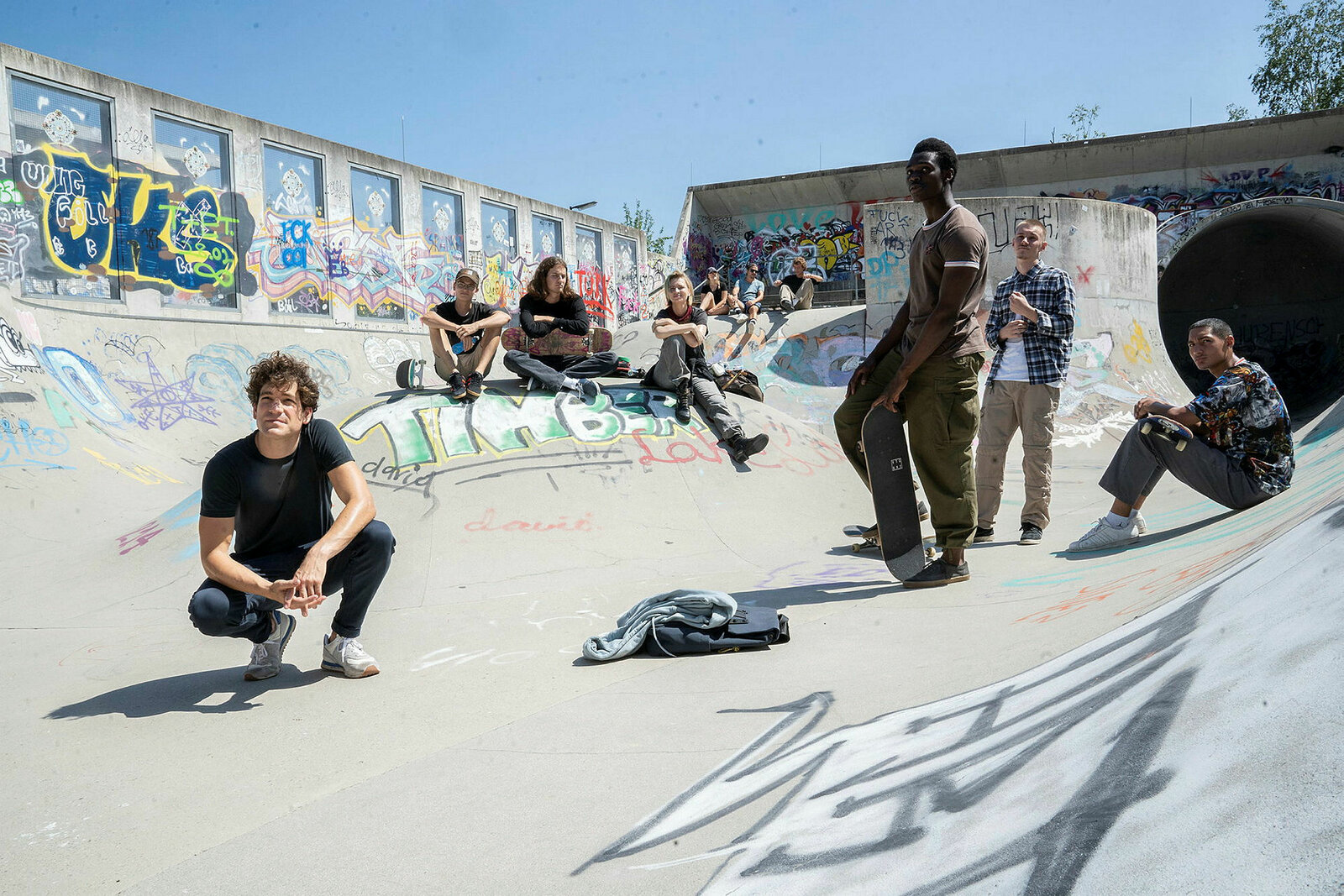 SöhneDie Chefin Söhne Jonathan Hutter als Korbinian Kirchner (l), Zoe Valks als Felicitas (4.v.l), Bless Amada als Fabi (3. v.r.) SRF/ZDF/Michael MarhofferBild: © SRF1