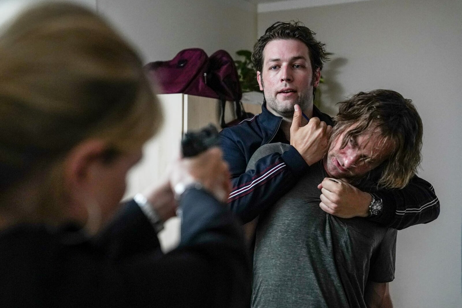 VerräterDer Ermittler und der Bordellinhaber werden handgreiflich: Stefan Rudolf als Jan Trompeter, Andreas Pietschmann als Amar LukicBild: © SRF/ZDF/ Michael Marhoffer