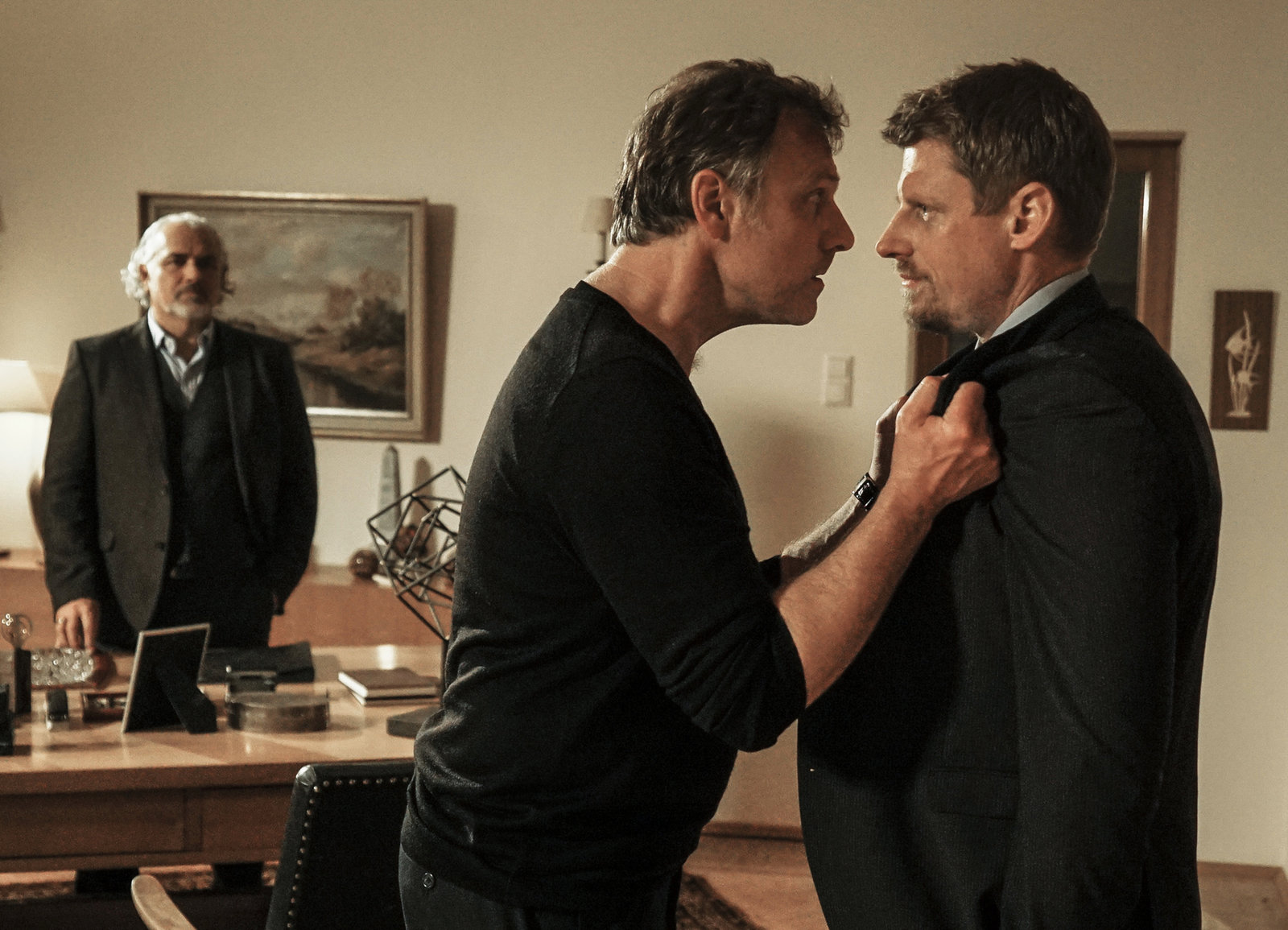 FamilieUneinigkeit unter Brüdern: Hansa Czypionka als Franz Koschwitz, Christoph Grunert als Bernd Koschwitz, Martin Gruber als Theo KoschwitzBild: © SRF/ZDF/ Michael Marhoffer