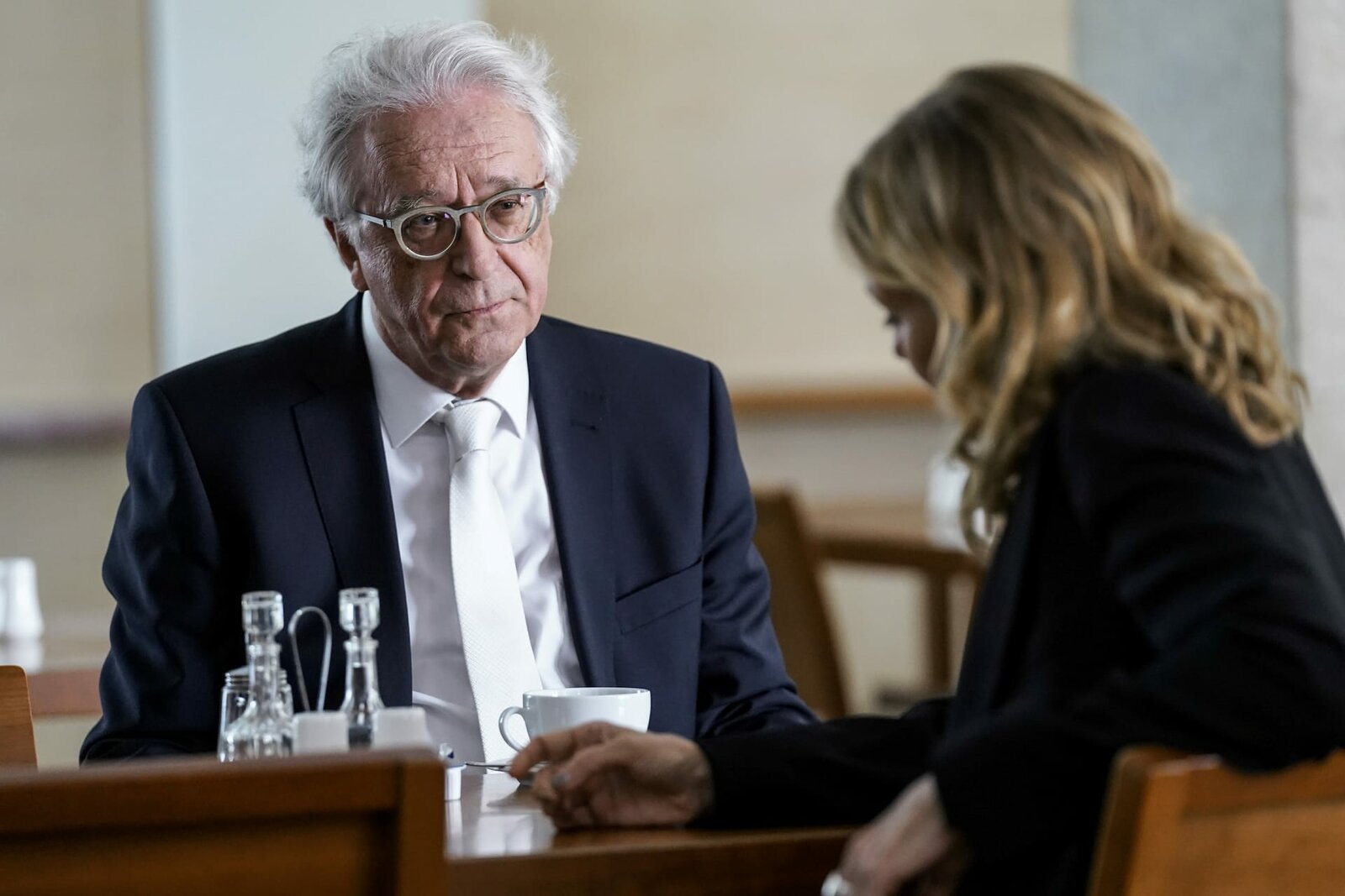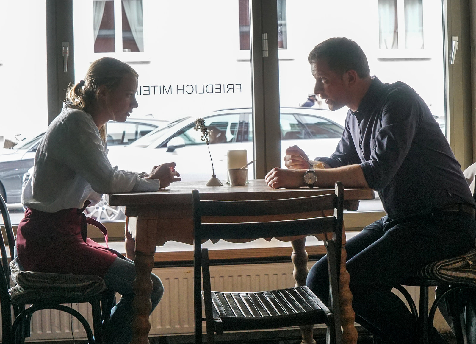 Guter Bulle, böser BulleDie traumatisierte Freundin und der Ermittler im Café: Jytte Merle Böhrnsen als Leonie Werner, Christoph Schechinger als Maximilian MurnauBild: © SRF/ ZDF/ Michael Marhoffer