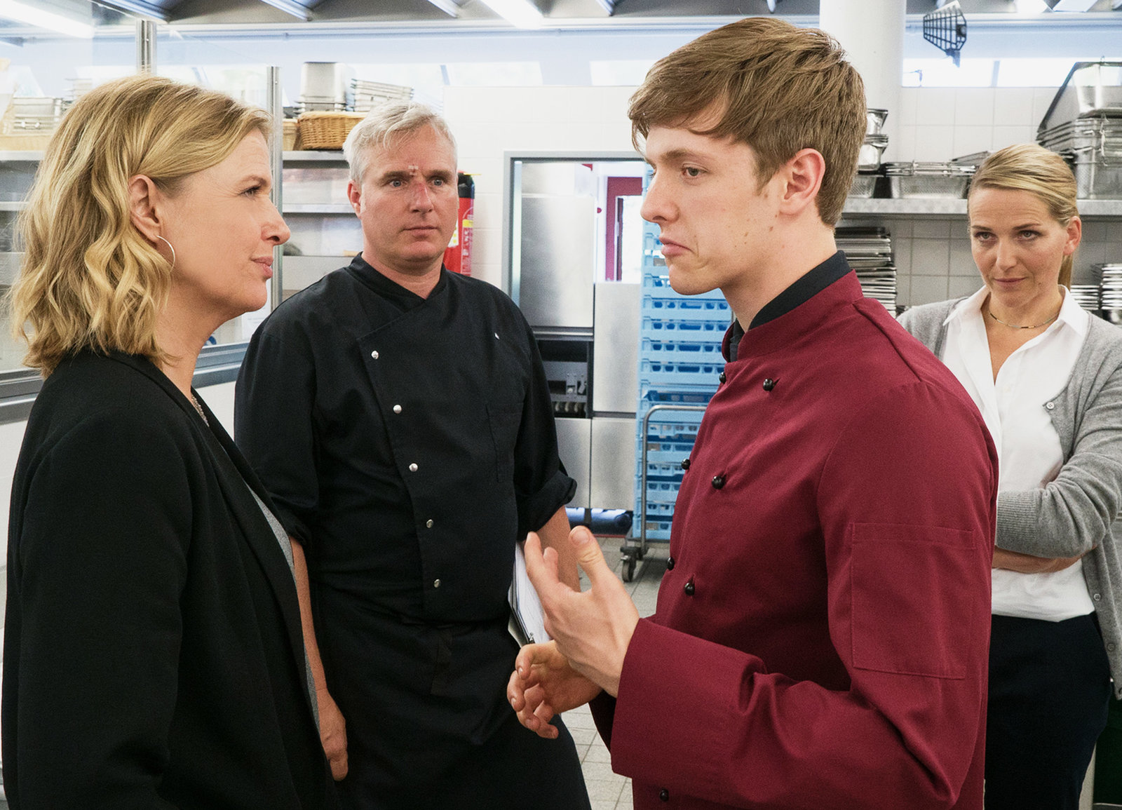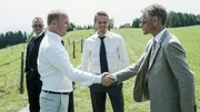 Ein ehrenwertes HausEine bordeauxrote Jacke und fragende Blicke: Maximilian Grill als Alexander Stockum, Jürgen Tonkel als Paul Böhmer, Katharina Böhm als Vera Lanz, Axel Pape als Hanskarl DemkeBild: © SRF / ZDF/ Michael Marhoffer