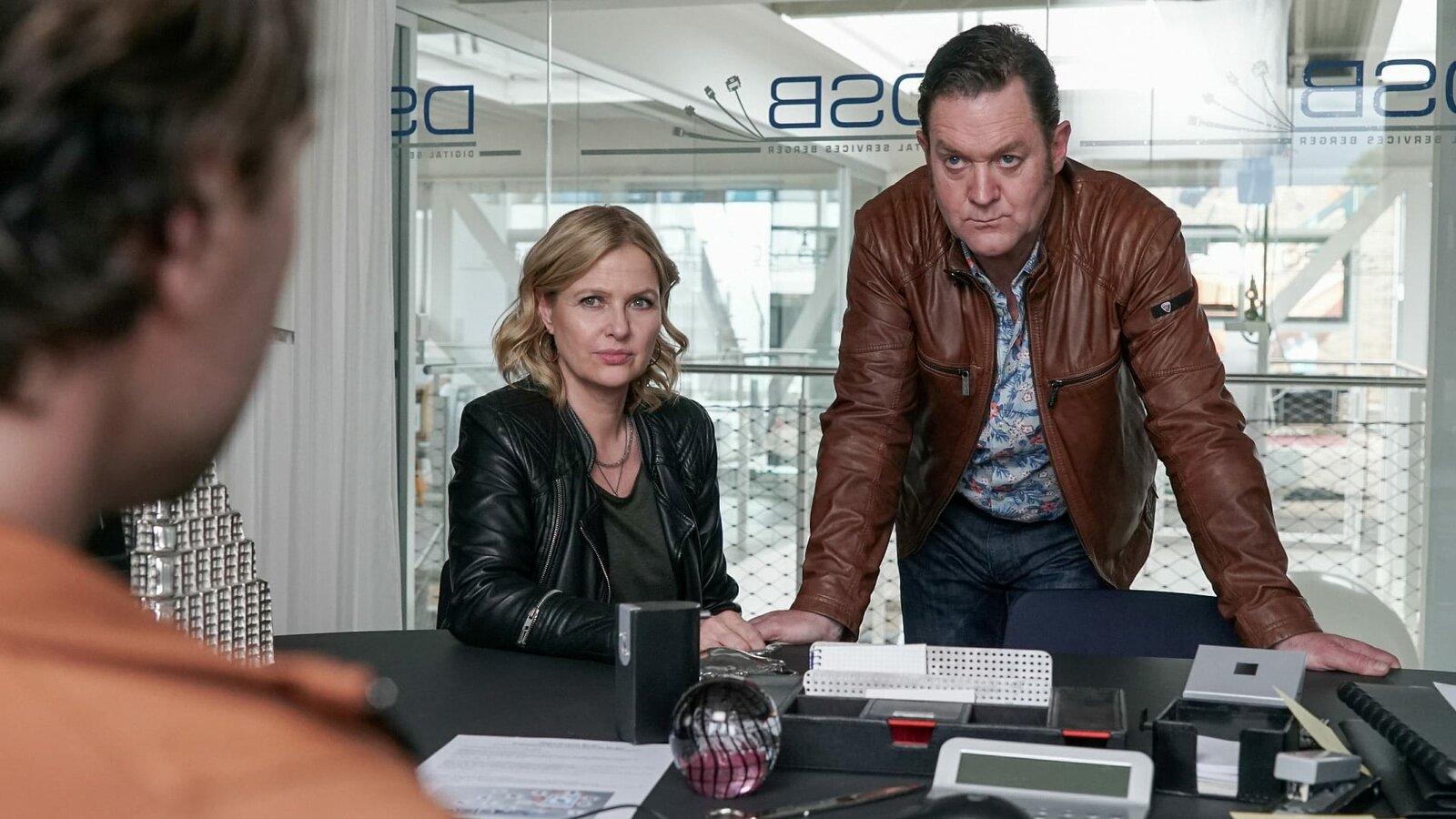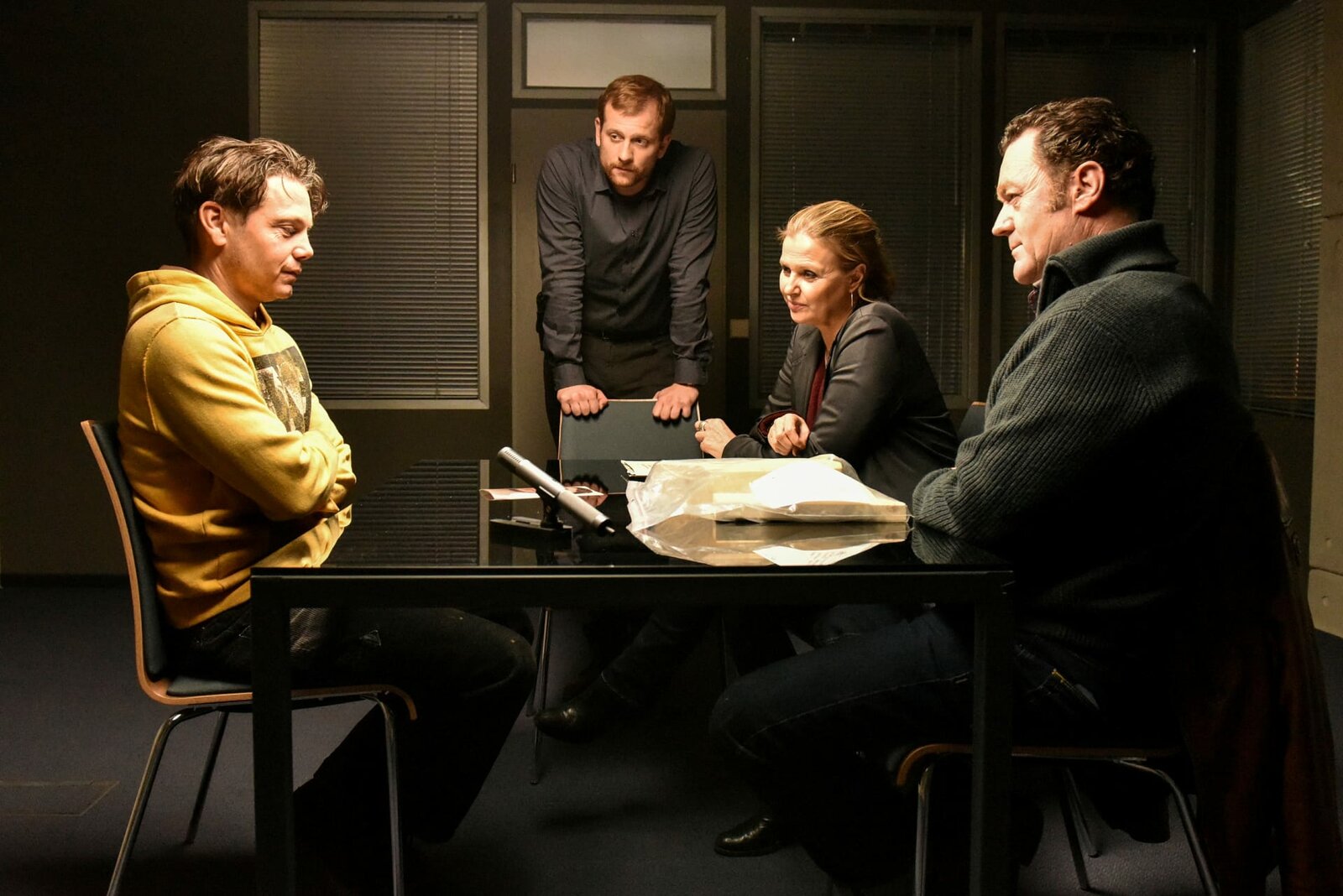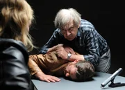 FamilienlöscherBrenzlige Situation beim Verhör: Katharina Böhm als Vera Lanz, André Jung als Benno Wiese (oben), Jürgen Tonkel als Paul Böhmer (unten)Bild: © SRF/ZDF/ Michael Marhoffer