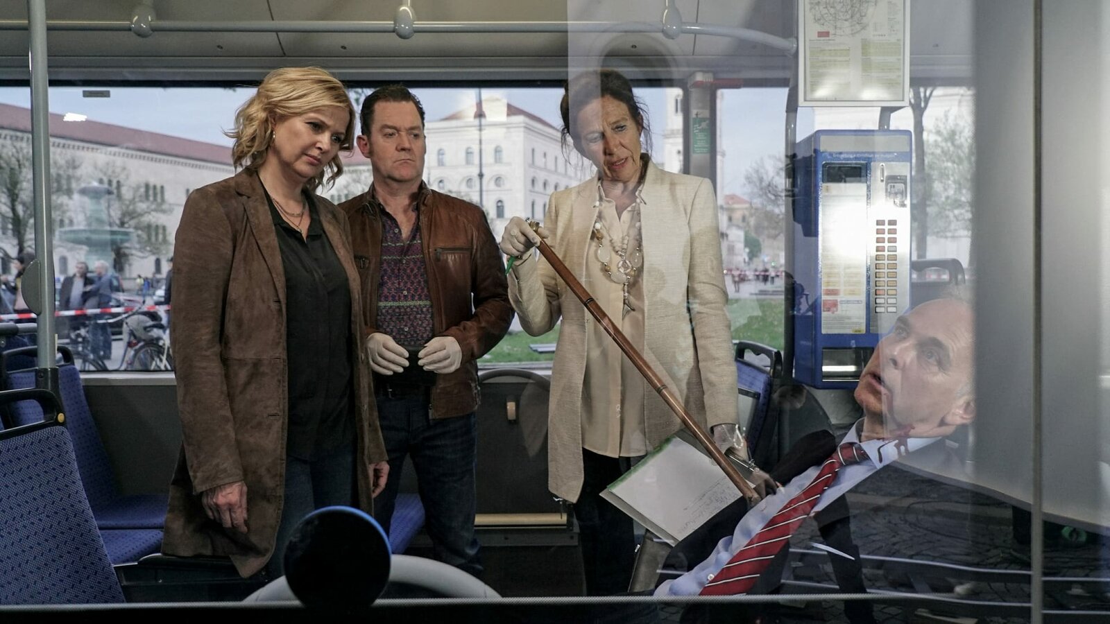 GlückVera Lanz (Katharina Böhm, l.), Paul Böhmer (Jürgen Tonkel, 2.v.l.) und Dr. Inge Rüders (Tatja Seibt, 2.v.r.) am Tatort. Sie stellen fest, dass Peter Häusler (Ralf Komorr, r.) an Messerstichen gestorben ist.Bild: © Sky Krimi