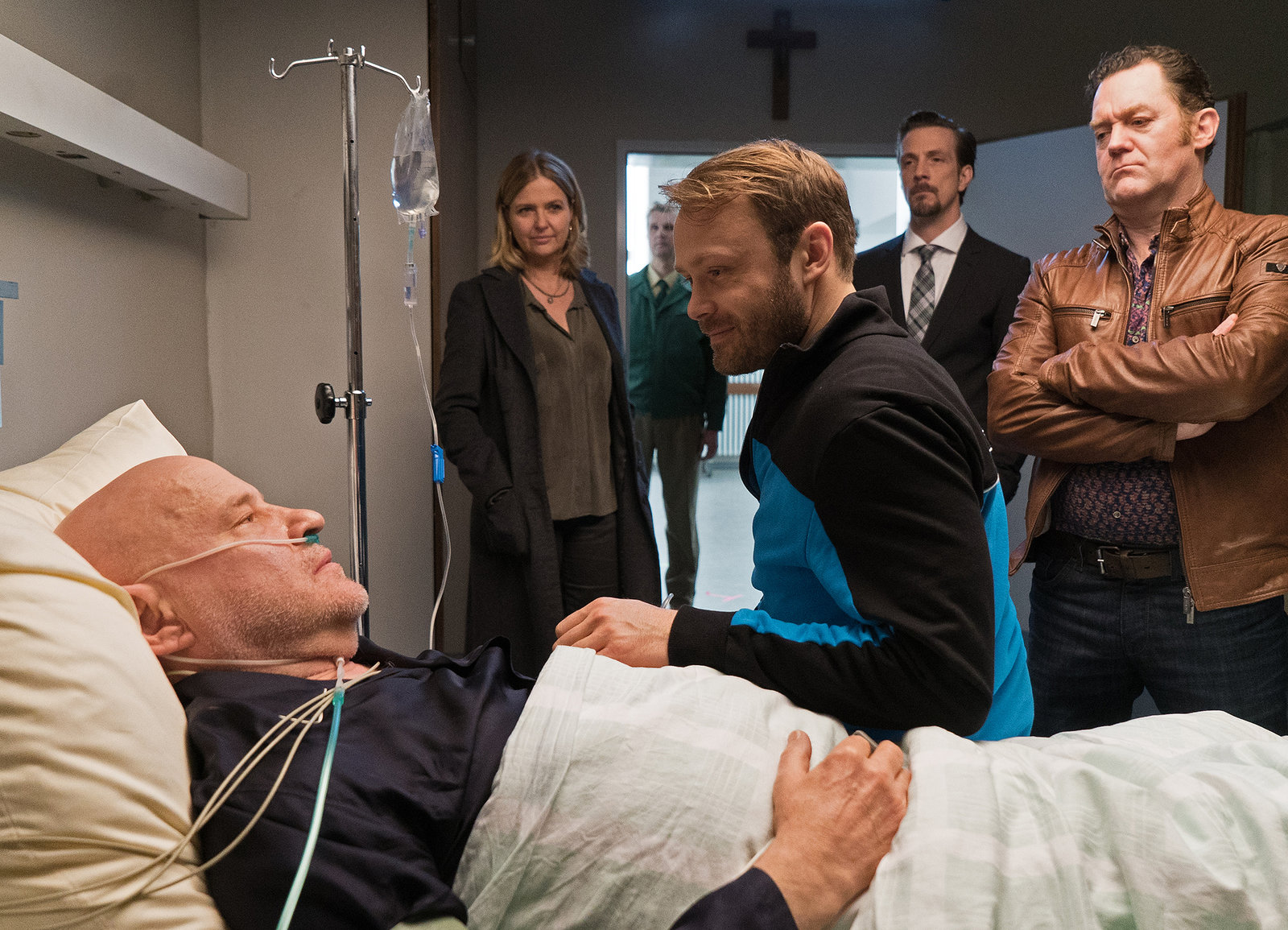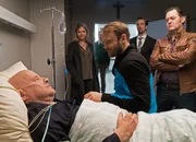 Kopf gegen HerzKrankenbesuch mit Polizeibegleitung: Christian Redl als Josef Köhler (liegend), Katharina Böhm als Vera Lanz (l.), Matthias Ziesing als Simon Köhler (M.), Jürgen Tonkel als Paul Böhmer (r.)Bild: © SRF/ZDF/ Michael Marhoffer