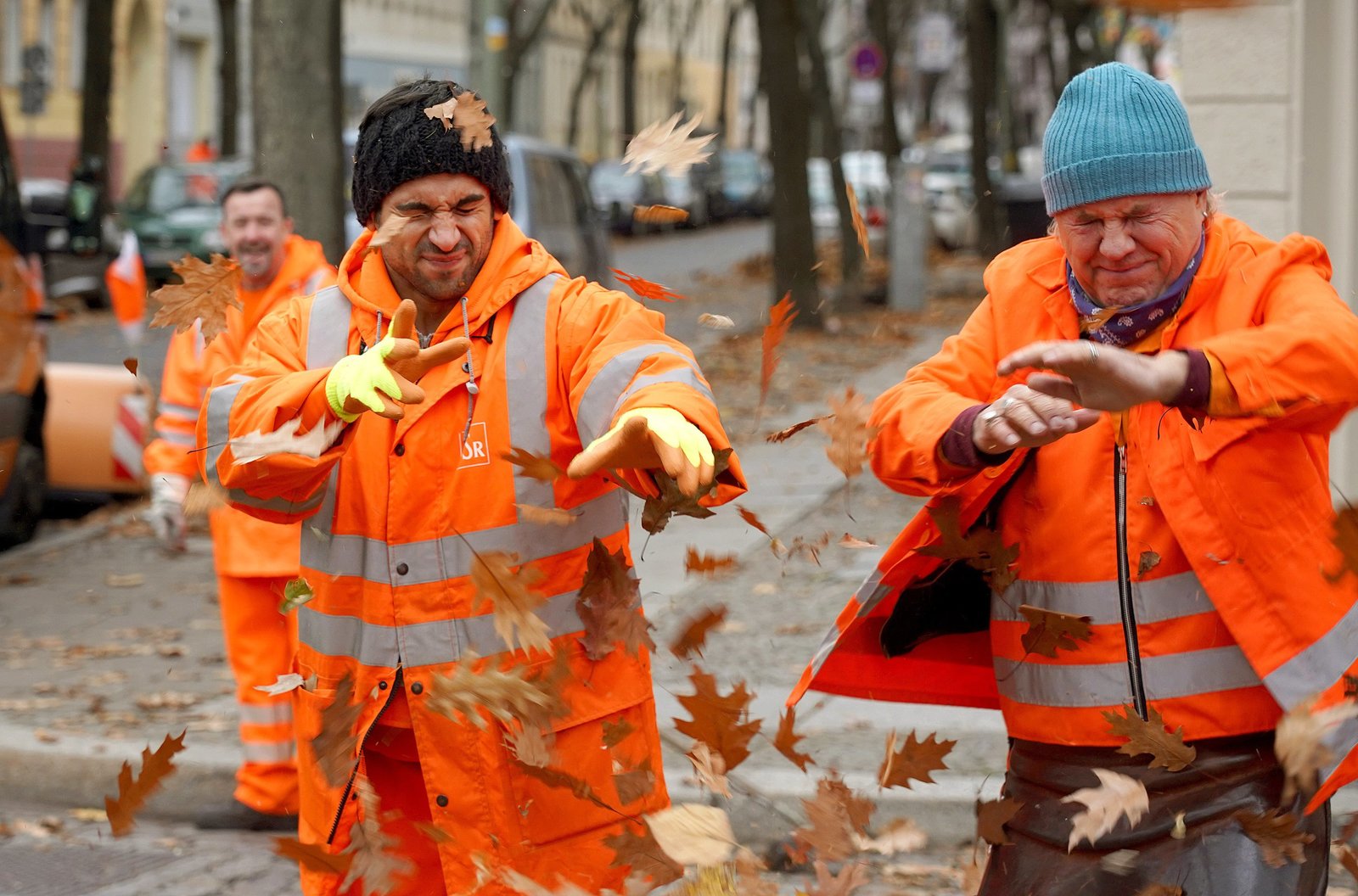 Baby an BordARD Degeto DIE DREI VON DER MÜLLABFUHR - BABY AN BORD, am Freitag (05.04.19) um 20:15 Uhr und um 01:20 Uhr im ERSTEN. Hier läuft was schief: Tarik (Daniel Rodic, 2. v. li.) und Werner (Uwe Ochsenknecht) bekommen das Laub vom Laubgebläse ab. © ARD Degeto/Britta Krehl, honorarfrei - Verwendung gemäß der AGB im engen inhaltlichen, redaktionellen Zusammenhang mit genannter Degeto-Sendung und bei Nennung "Bild: ARD Degeto/Britta Krehl" (S2+). ARD Degeto/Programmplanung und Presse, Tel: 069/1509-335, degeto-presse@degeto.deBild: © ARD Degeto/Britta Krehl