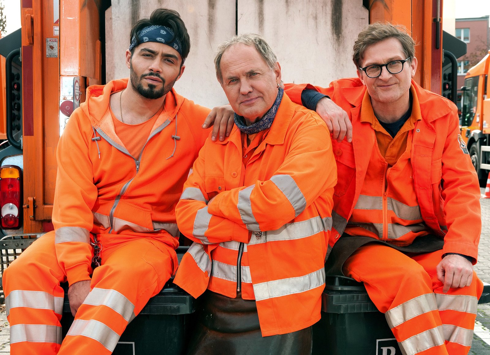 Mission ZukunftARD Degeto DIE DREI VON DER MÜLLABFUHR - MISSION ZUKUNFT, am Freitag (29.05.20) um 20:15 Uhr im ERSTEN. „Käpt’n“ Werner Träsch (Uwe Ochsenknecht, Mitte), Ralle (Jörn Hentschel, re.) und Tarik (Aram Arami) bekommen einen Schülerpraktikanten mitsamt Spezialauftrag aufs Auge gedrückt. © ARD Degeto/Britta Krehl, honorarfrei - Verwendung gemäß der AGB im engen inhaltlichen, redaktionellen Zusammenhang mit genannter Degeto-Sendung und bei Nennung "Bild: ARD Degeto/Britta Krehl" (S2+). ARD Degeto/Programmplanung und Presse, Tel: 069/1509-335, degeto-presse@degeto.deBild: © ARD Degeto/Britta Krehl