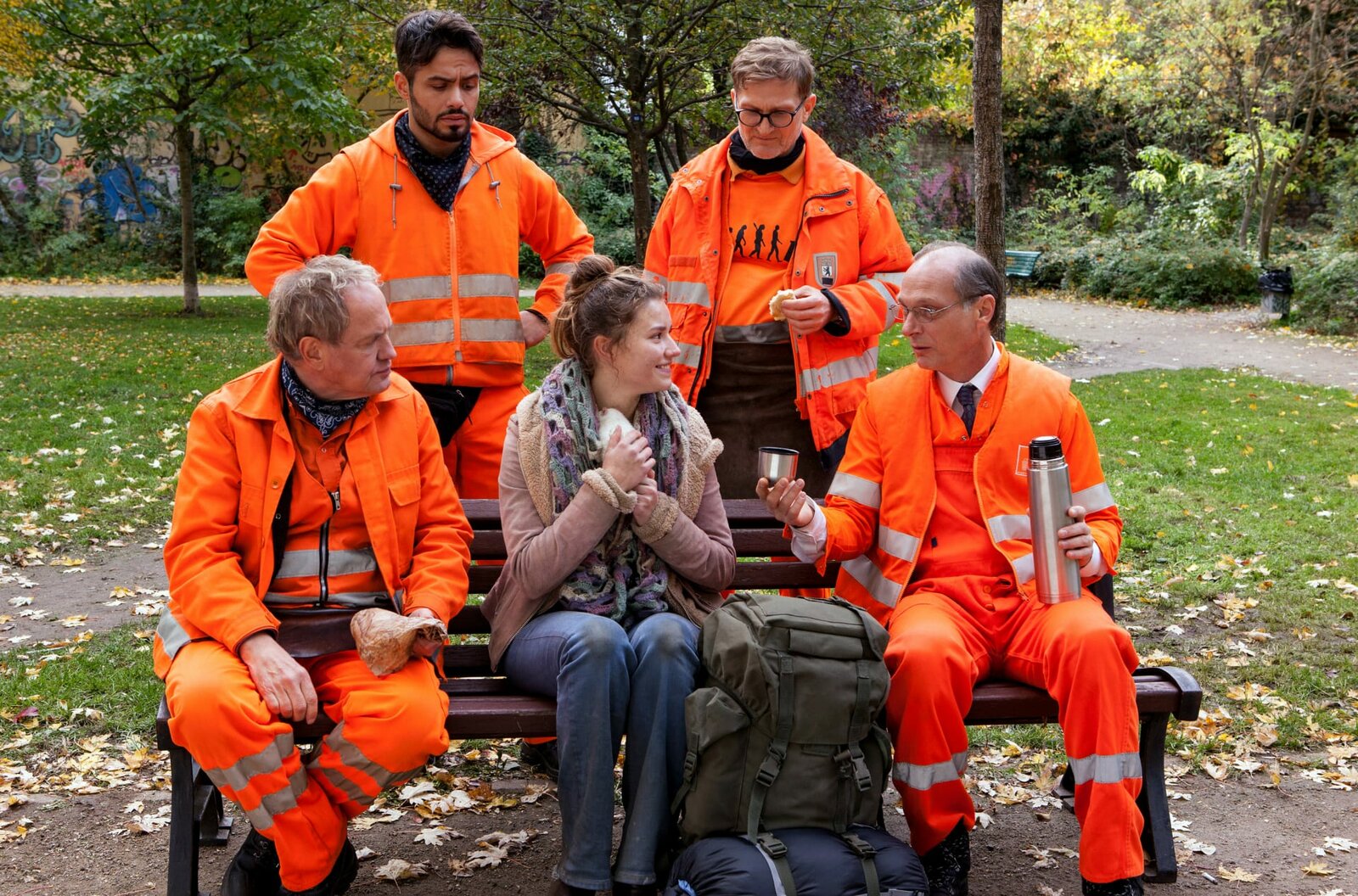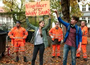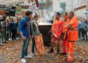 Mission ZukunftARD Degeto DIE DREI VON DER MÜLLABFUHR - MISSION ZUKUNFT, am Freitag (29.05.20) um 20:15 Uhr im ERSTEN. Zündeln ist nicht! Von links nach rechts: „Käpt’n“ Werner Träsch (Uwe Ochsenknecht), Ralle (Jörn Hentschel) und Tarik (Aram Arami) stoppen die Schülerdemo von Selma (Lara Aylin Winkler) und Dennis (Ben Litwinschuh). © ARD Degeto/Britta Krehl, honorarfrei - Verwendung gemäß der AGB im engen inhaltlichen, redaktionellen Zusammenhang mit genannter Degeto-Sendung und bei Nennung "Bild: ARD Degeto/Britta Krehl" (S2+). ARD Degeto/Programmplanung und Presse, Tel: 069/1509-335, degeto-presse@degeto.deBild: © ARD Degeto/Britta Krehl / ARD Degeto/Programmplanung und P