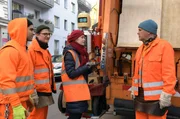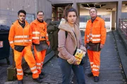 Dörte muss wegFrau an Bord: „Käpt’n“ Werner (Uwe Ochsenknecht, re.), Tarik (Daniel Rodic, li.) und Ralle (Jörn Hentschel) müssen Dr. Hanna Keller (Inez Bjørg David) auf ihrem Müllwagen mitnehmen.Bild: © ARD Degeto/Britta Krehl