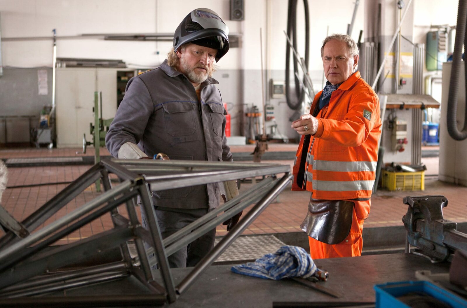 Operation MiethaiFrei nach Beuys: Jeder kann ein Künstler sein! Specki (Frank Kessler, li.) und Werner (Uwe Ochsenknecht) beim Schweißen.Bild: © ARD Degeto/Britta Krehl