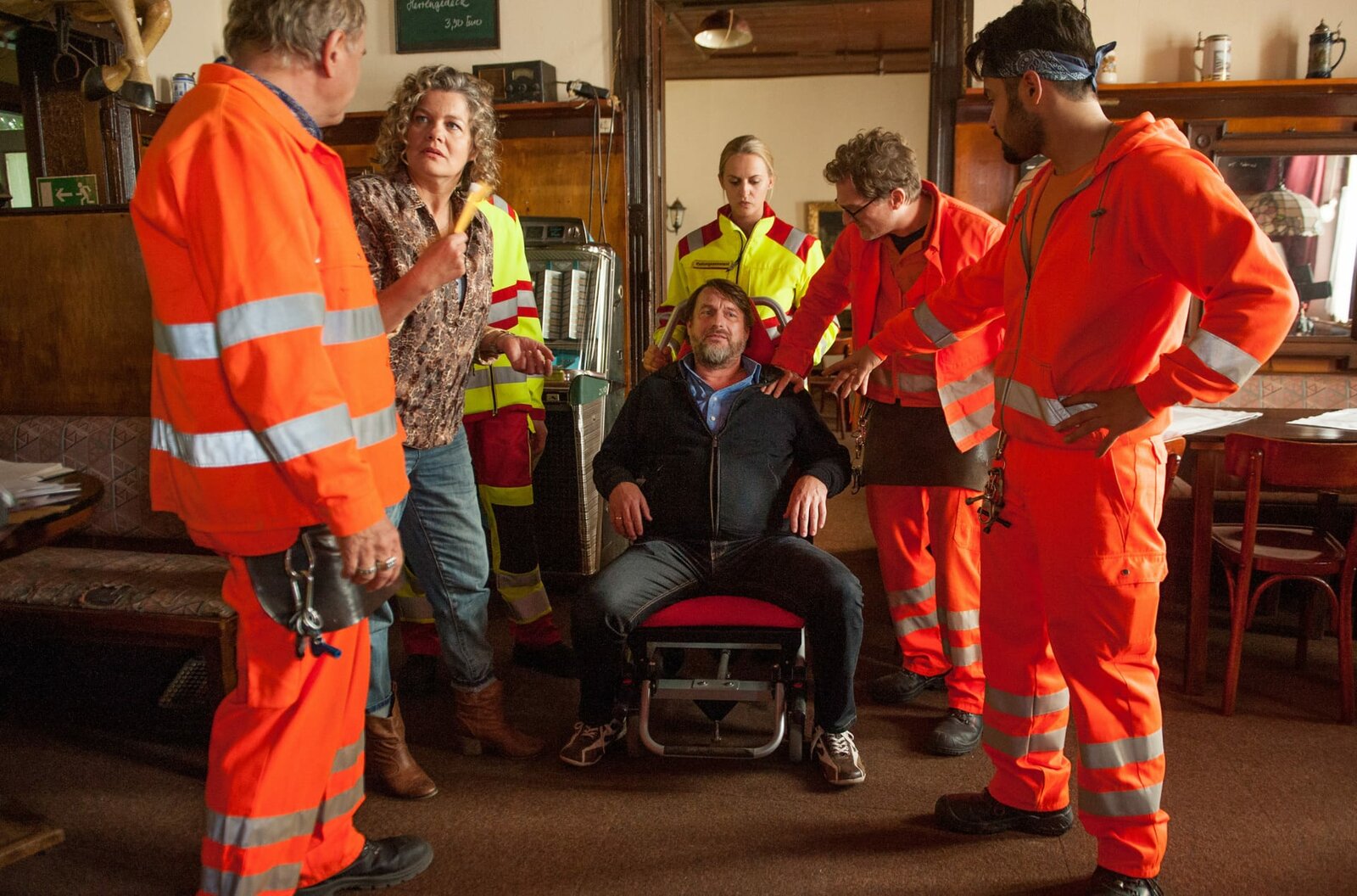 KassensturzARD Degeto DIE DREI VON DER MÜLLABFUHR - KASSENSTURZ, am Freitag (05.06.20) um 20:15 Uhr und um 01:20 Uhr im ERSTEN. „Käpt´n“ Werner Träsch (Uwe Ochsenknecht, li.), Ralle (Jörn Hentschel) und Tarik (Aram Arami, re.) sorgen sich um Lothar (Peter Trabner, sitzend) und seine Frau Regine (Birge Schade). © ARD Degeto/Britta Krehl, honorarfrei - Verwendung gemäß der AGB im engen inhaltlichen, redaktionellen Zusammenhang mit genannter Degeto-Sendung und bei Nennung "Bild: ARD Degeto/Britta Krehl" (S2+). ARD Degeto/Programmplanung und Presse, Tel: 069/1509-335, degeto-presse@degeto.deBild: © ARD Degeto/Britta Krehl