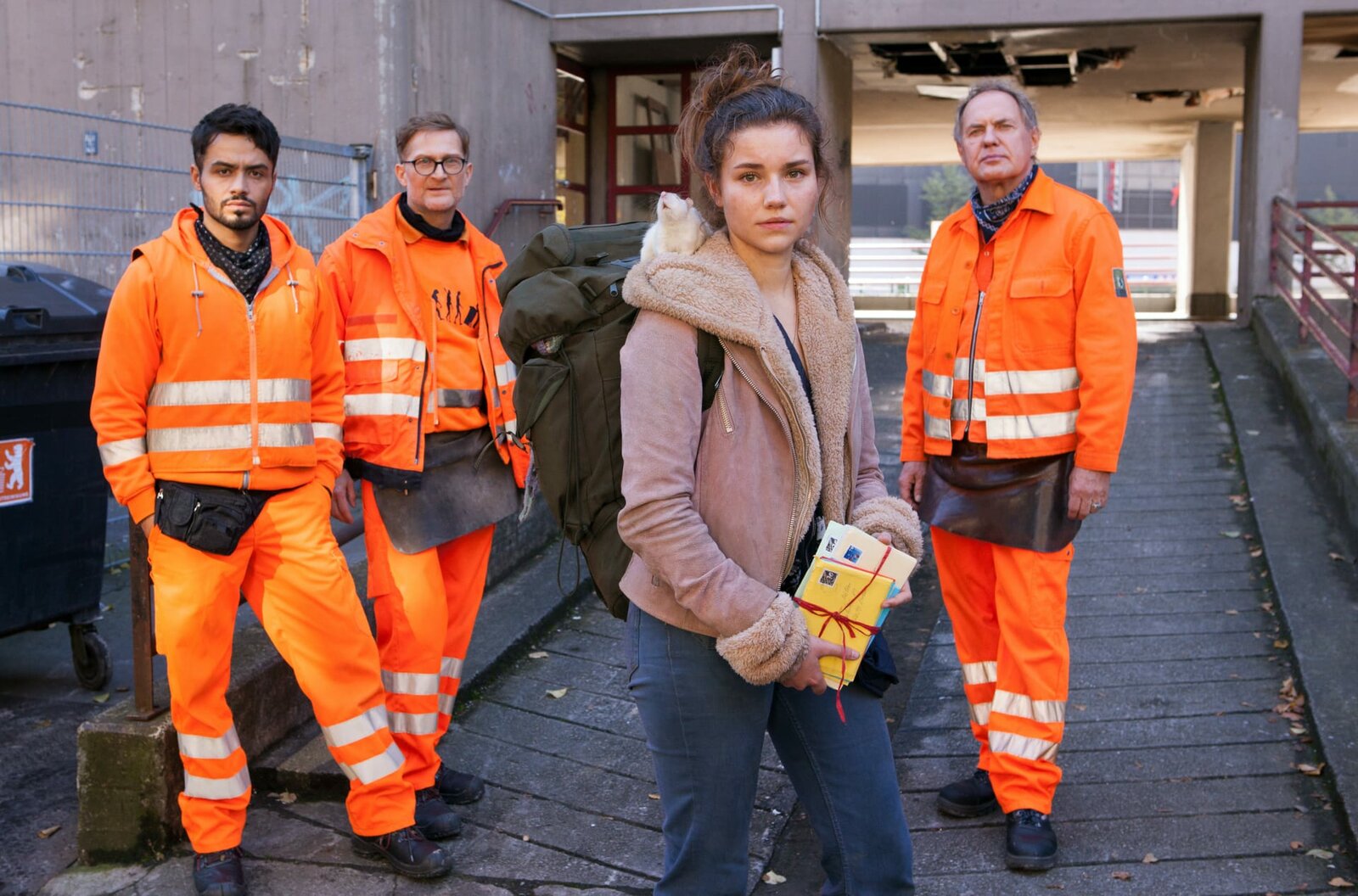Die StreunerinV. li. n. re.: Luna (Carolin Garnier), Werner (Uwe Ochsenknecht), Tarik (Aram Arami), Ralle (Jörn Hentschel) und Felsenhain (Martin Brambach) im Müllwagen.Bild: © ARD Degeto/Britta Krehl