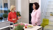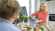 Folge 7Ernährungs-Doc Anne Fleck (r.) empfiehlt Claudia B. (l.) für unterwegs einen Eiweiß-Shake: Er sättigt und enthält kaum Kohlenhydrate – die lassen den Blutzuckerspiegel steigen.Bild: © SWR/NDR