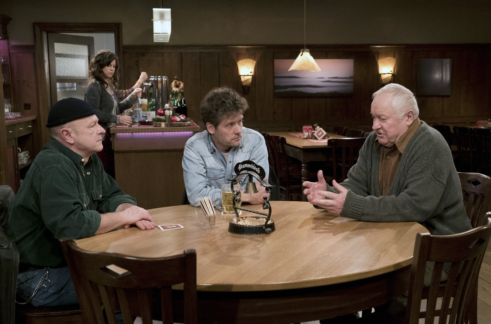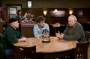 Ganzer EinsatzZimmermann Senior (Luis Lamprecht, re.) kommt aus der Kur zurück und freut sich auf den Stammtisch. Dort trifft er aber nur Toni (Roland Frey, li.) und Markus Riedle (Sebastian Mirow).Bild: © SWR/Schweigert
