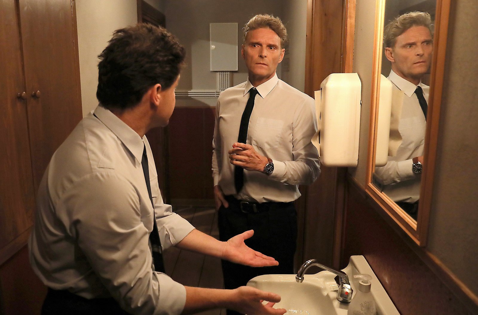 Ein bisschen Schwund ist immerKommandant der Schönwalder Feuerwehr Uli Zimmermann (Bernd Lambrecht, re.), der zum Gespräch ins Rathaus bestellt wurde, hat kein gutes Gefühl, hier mit Jürgen (Olaf Creutzburg, li.)Bild: © SWR/