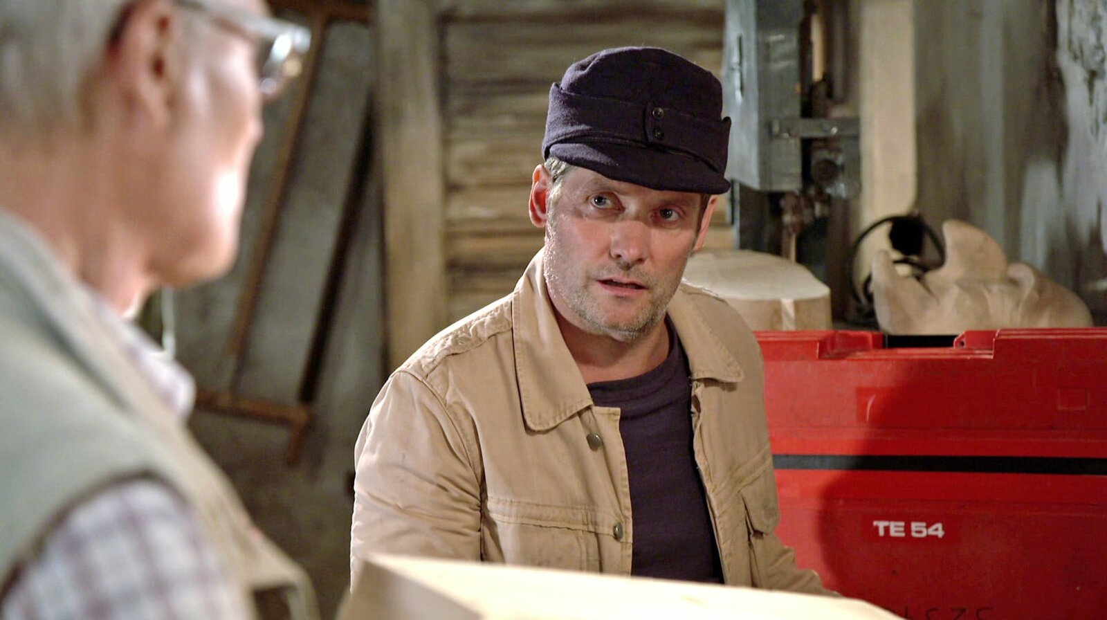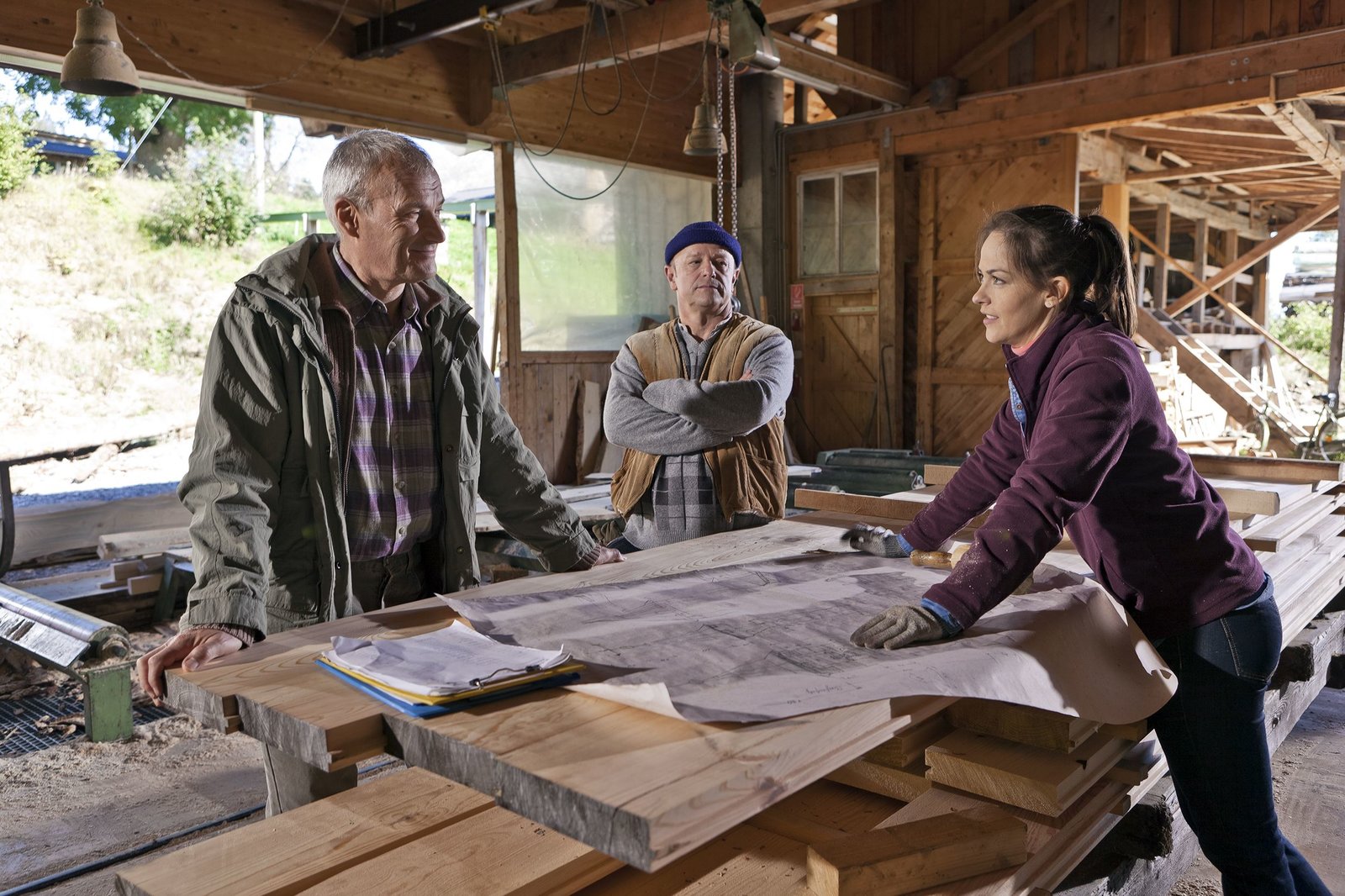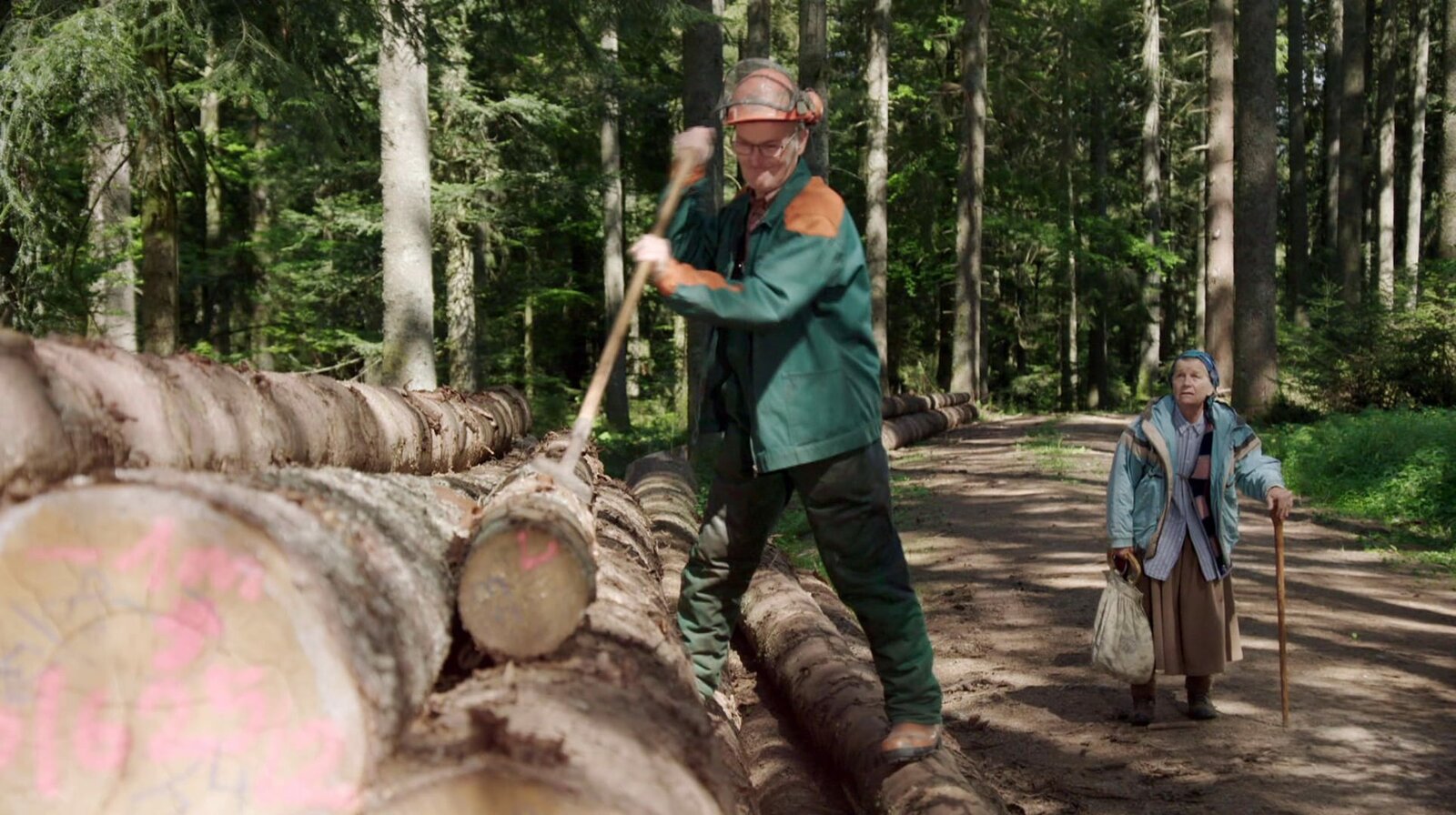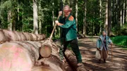 Eine Menge HolzLioba Weber (Lisbeth Felder, re.) kann’s nicht lassen, an Karl Faller (Peter Schell, li.) herumzukritteln, während der in seinem Wald alles tut, um gegen den Borkenkäfer anzukämpfen.Bild: © SWR