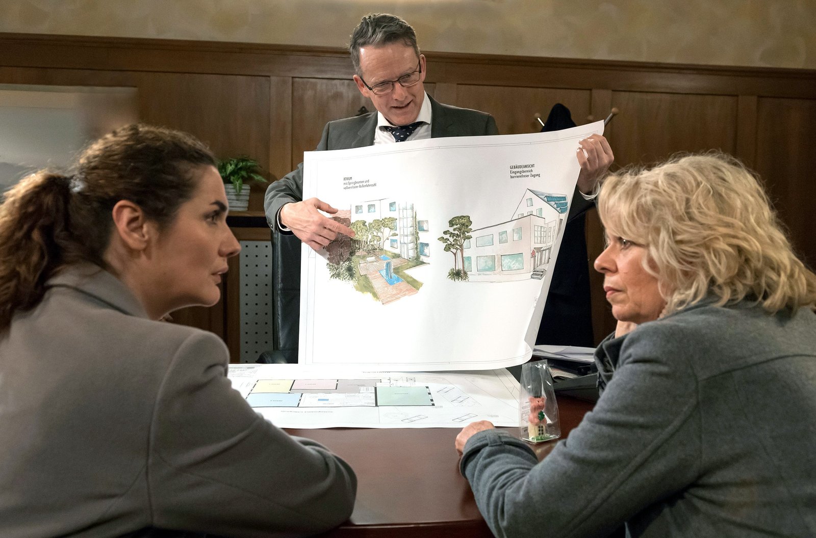 TiefschlagIn naher Zukunft jedoch soll der Ort Schönwald ein Gesundheitszentrum bekommen und im Bürgermeisteramt werden bereits große Pläne ausgerollt. V.li.: Monique (Anne von Linstow), Bernhard (Karsten Dörr) und Kati (Christiane Bachschmidt).Bild: © SWR/Alexander Kluge