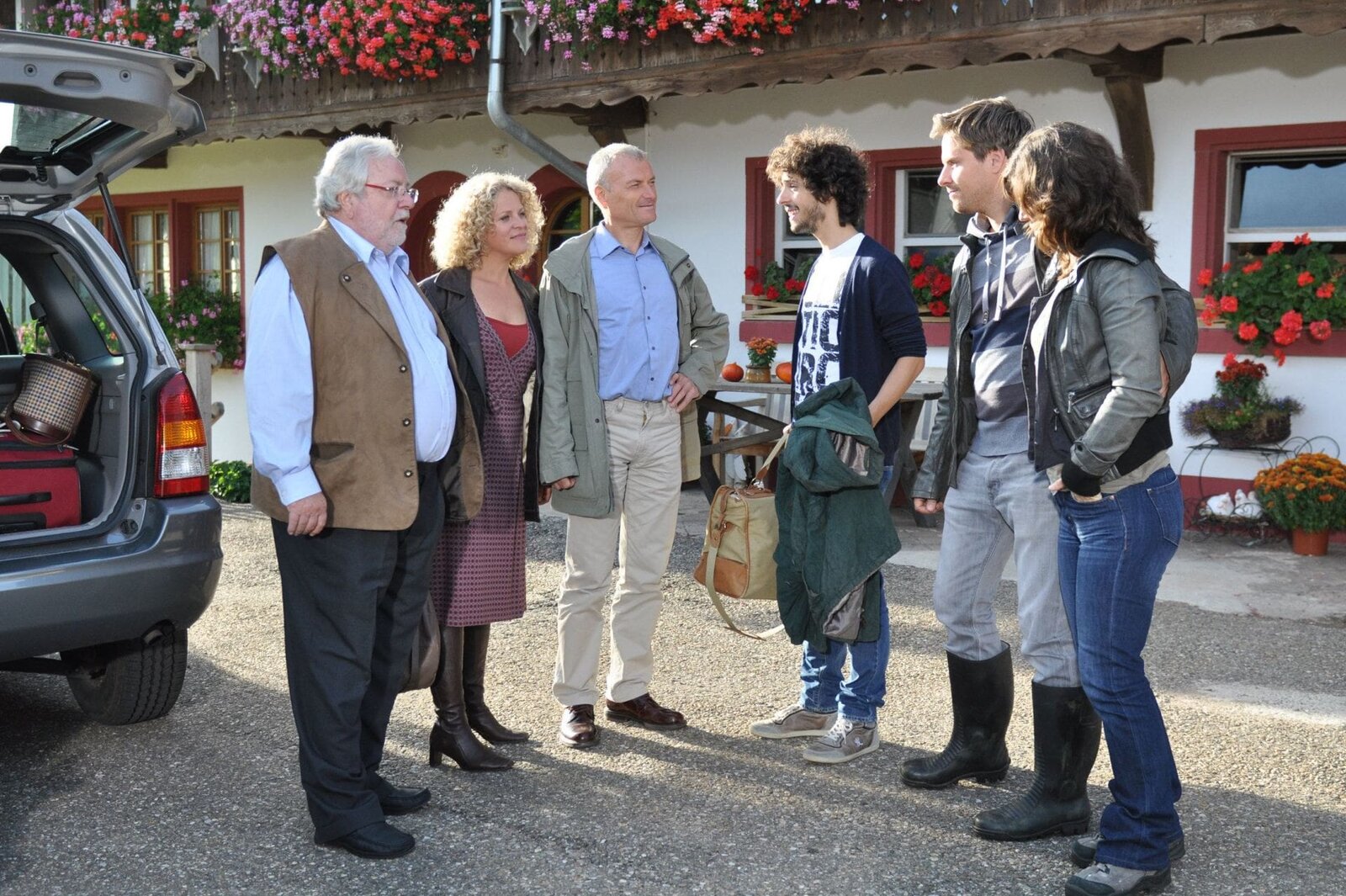 ErleuchtungSWR Fernsehen DIE FALLERS - DIE SWR SCHWARZWALDSERIE FOLGE 786, "Erleuchtung", am Sonntag (27.10.13) um 19:15 Uhr. Bea und Karl werden nach ihrem Urlaub wieder auf dem Hof empfangen. v.l.: Hermann (Wolfgang Hepp), Bea (Christiane Brammer), Karl (Peter Schell), Albert (Alessio Hirschkorn), Andreas (Ralph Gassmann), Eva (Lucie Muhr)Bild: © SWR/Appel