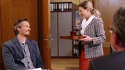 Dunkle FleckenNachdem Bernhard (Karsten Dörr, re.) wegen des Böllerverbots an Silvester anonyme Drohbriefe erhalten hat, taucht dank Celines Vermittlung ein attraktiver „Dr. Schröder“ (Stefan Roschy, li.) im Rathaus auf. Sehr zur Freude von Claudia Heilert (Adelheid Theil, Mi.).Bild: © SWR