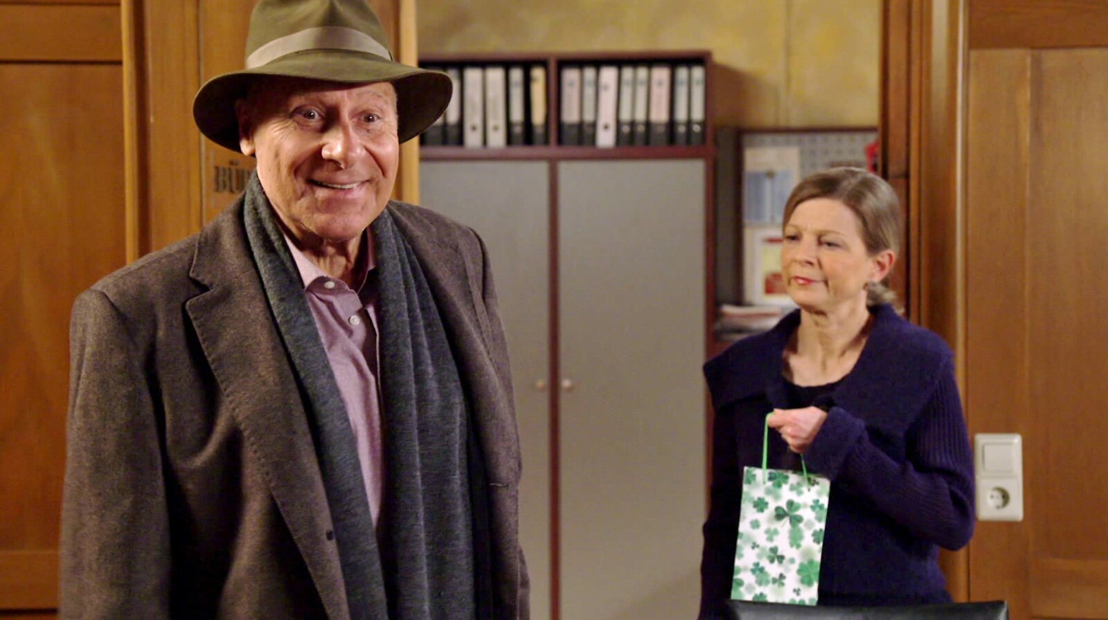 Alles KäseGanz beseelt von ihrer Fortbildung kommt Frau Heilert (Adelheid Theil) zurück ins Schönwalder Rathaus. Nun ist sie also eine waschechte Standesbeamtin, re. Ratsschreiber Herr Weiss (Christoph Hagin).Bild: © SWR/Alexander Kluge
