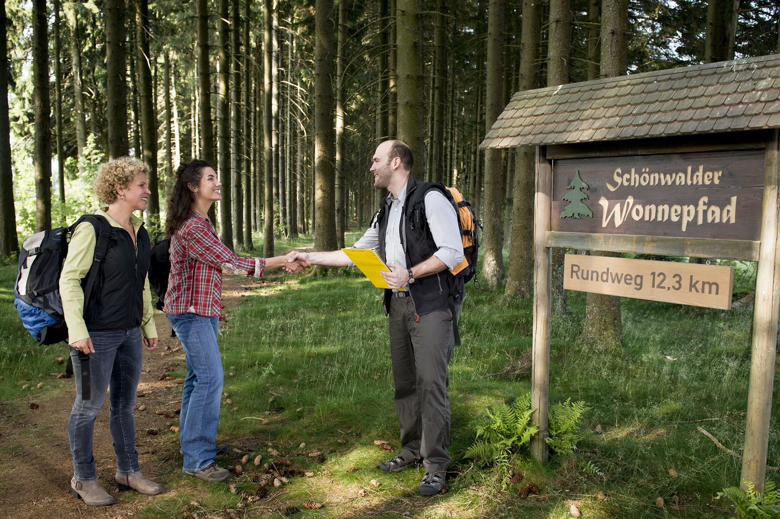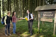 VerwirrungBea (Christiane Brammer, li.) und Monique (Anne von Linstow) sind nervös. Sie begrüßen Herrn Bäumler (Martin Weigel), den Prüfer für den Wonnepfad.Bild: © SWR/Zengerling