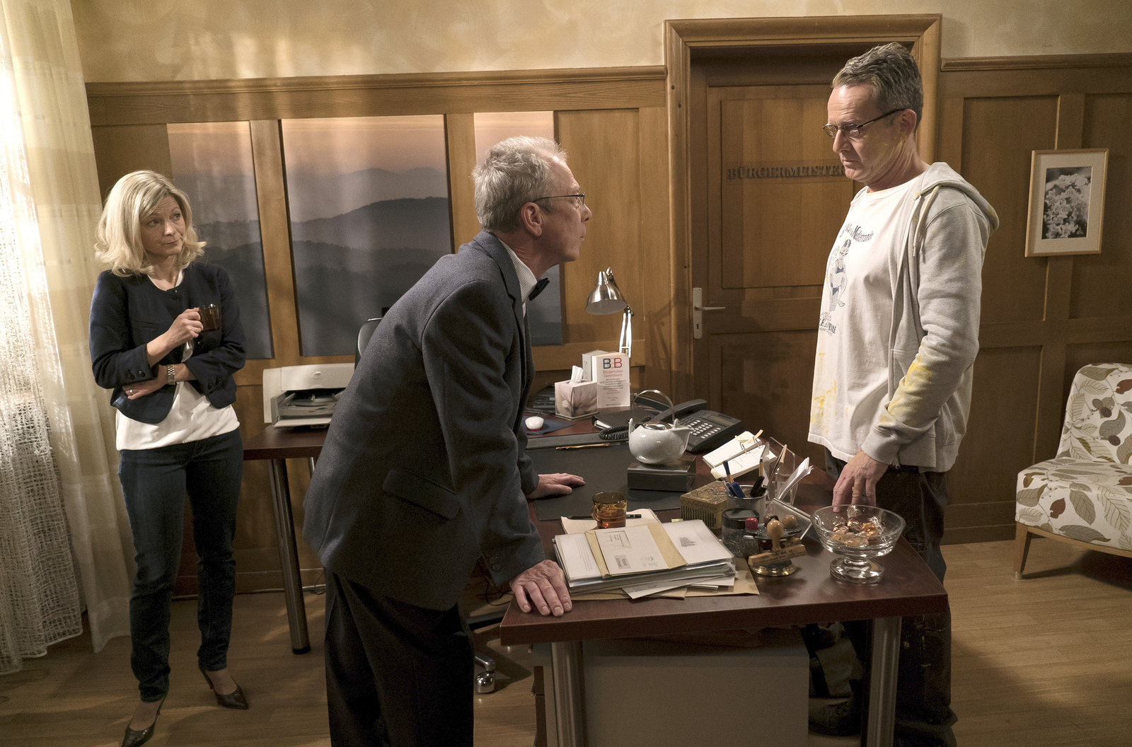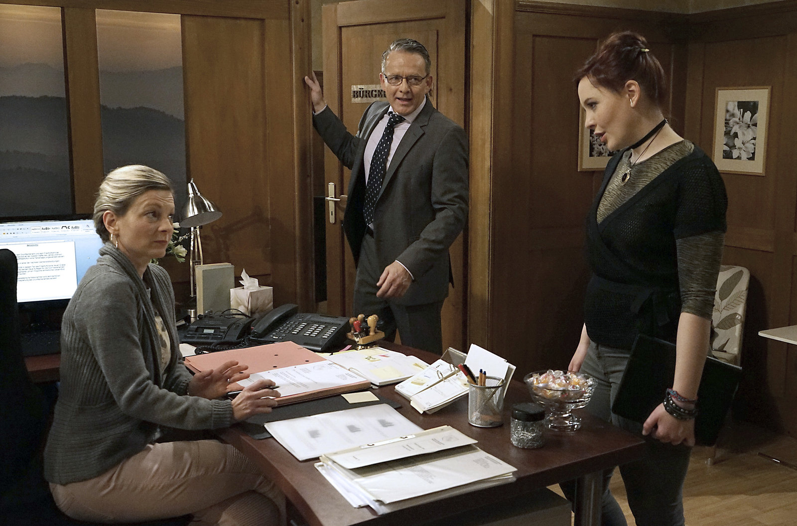 FremdkörperDie neue Sozialarbeiterin Lissy Trautmann bringt frischen Wind ins Rathaus von Schönwald. v.l.: Frau Heilert (Adelheid Theil), Bernhard (Karsten Dörr), Lissy (Elinor Eidt)Bild: © SWR/Krieg
