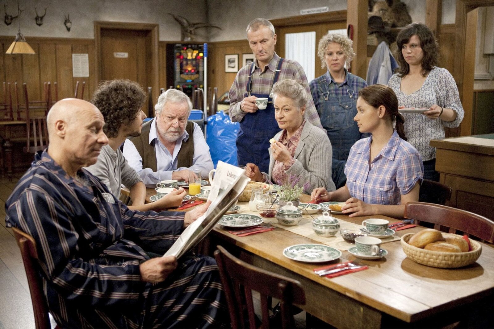 Die grüne MambaSWR Fernsehen DIE FALLERS - DIE SWR SCHWARZWALDSERIE FOLGE 776, "Die grüne Mamba", am Sonntag (26.05.13) um 19:15 Uhr. Bei Eva im Löwen ist volles Haus, da die gesamte Familie bei ihr Unterschlupf gefunden hat. Es herrscht Ausnahmezustand. v.l.: Franz (Edgar-M. Marcus), Albert (Alessio Hirschkorn), Hermann (Wolfgang Hepp), Karl (Peter Schell), Johanna (Ursula Cantieni), Bea (Christiane Brammer), Jenny (Julia Obst), Eva (Lucie Muhr)Bild: © SWR/Martin Furch