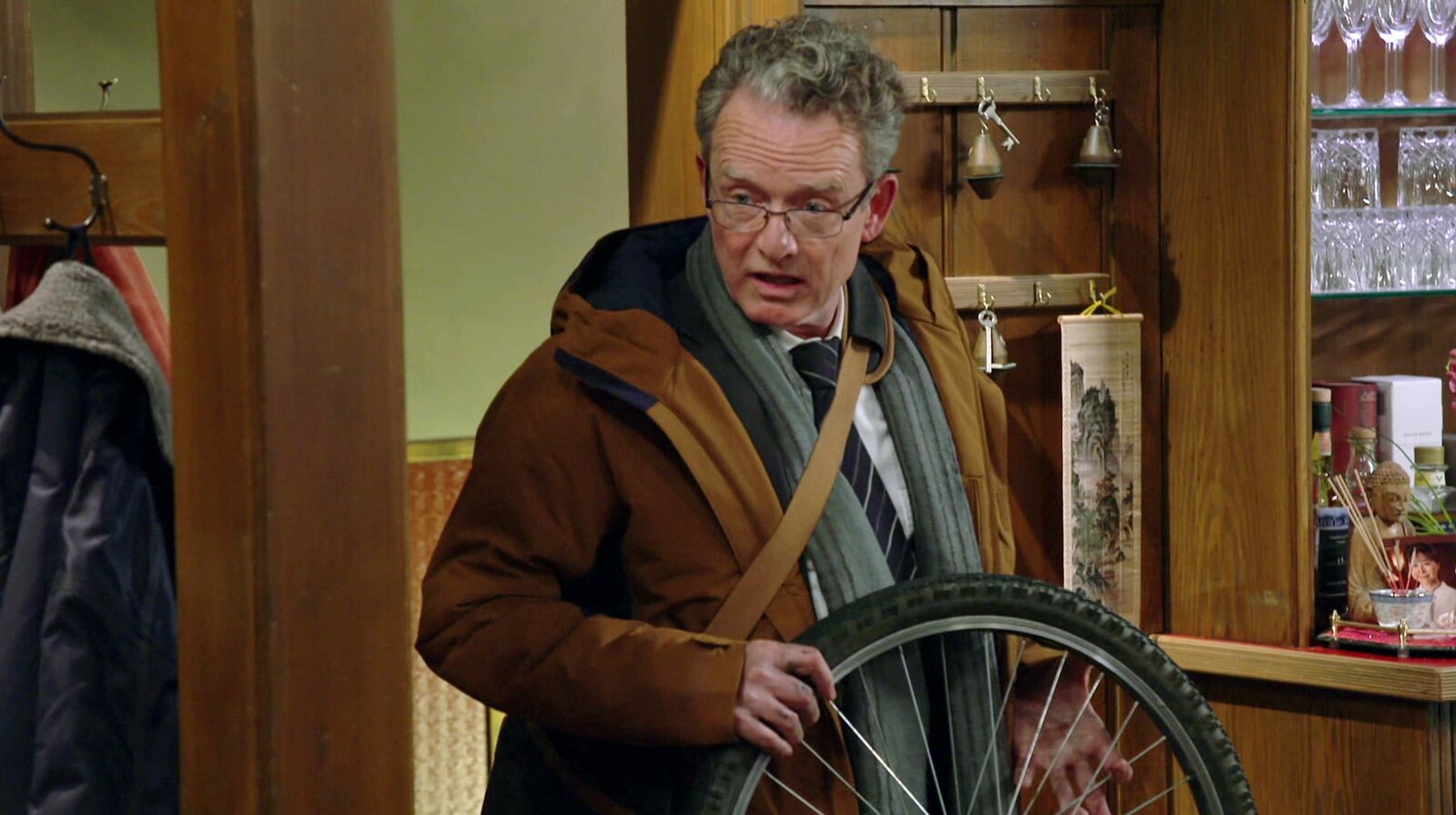 Stabile SeitenlageWährend Johanna (Ursula Cantieni) versucht, mehr Platz ins Wohnzimmer zu bekommen, rollt Hermann (Wolfgang Hepp) eine uralte Minibar herein, die künftig den Raum verschönern soll.Bild: © SWR/Johannes Krieg