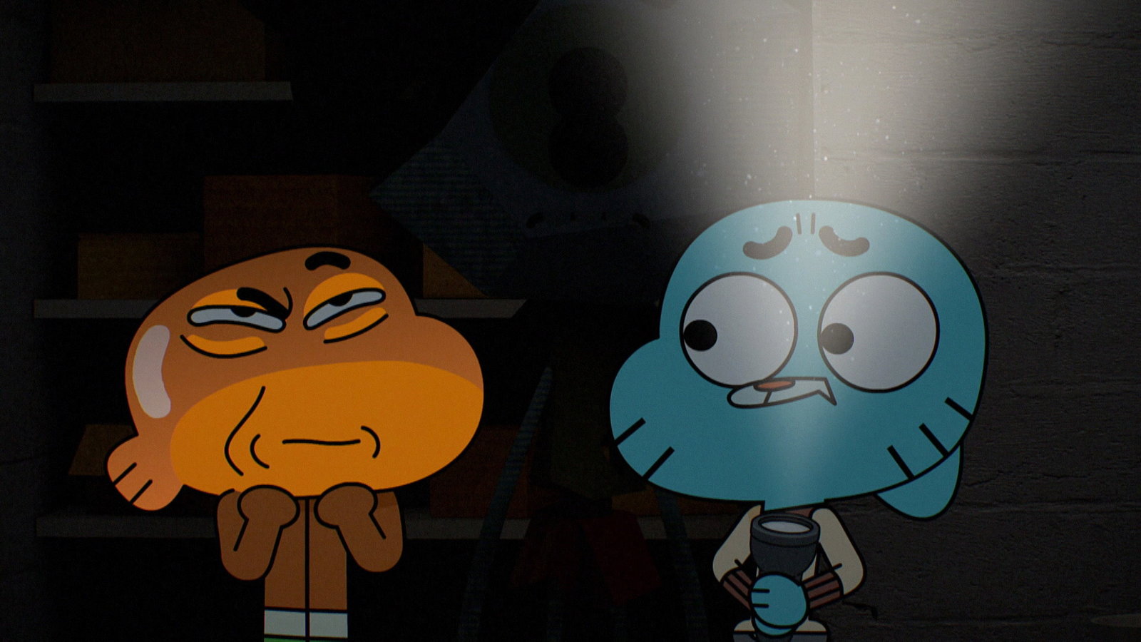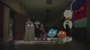 Der NiemandDarwin und Gumball sind auf der Suche nach einer Geheimtür.Bild: © ZDF und Turner Broadcasting System International