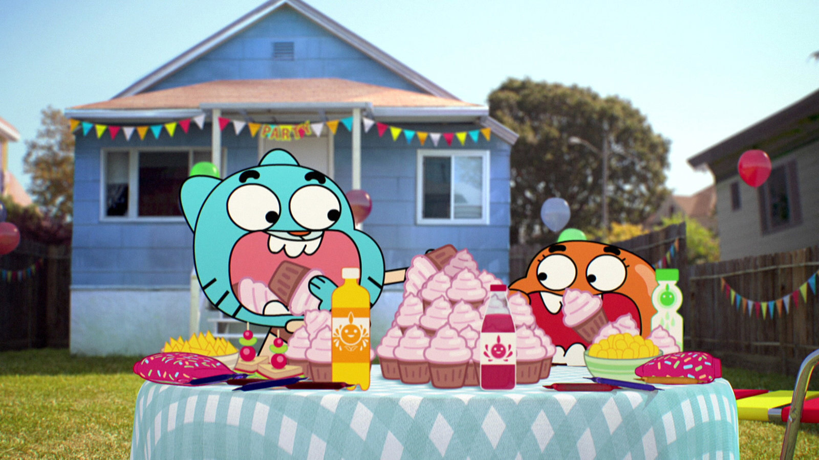 Der FreundAnais hat Geburtstag, doch bevor die Gäste kommen, futtern Gumball (li.) und Darwin (re.) alles auf.Bild: © ZDF/Turner Broadcasting System International