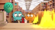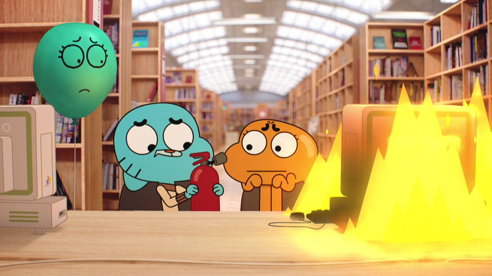 Der FreundGumball hat den Computer der Bibliothek in Brand gesetzt.Bild: © ZDF/Turner Broadcasting System International