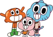 Die BrosDarwin (Mi.) drängt sich zwischen Penny (li.) und Gumball (re.).Bild: © ZDF/Turner Broadcasting System International