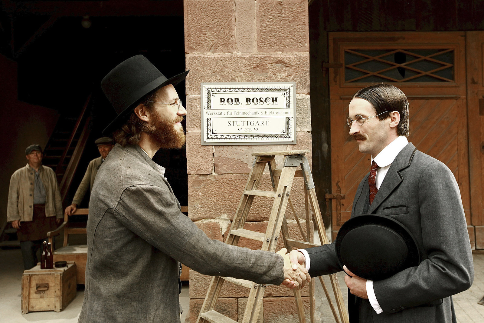 Wie wir zu Fabrikherren und Arbeitern wurdenRobert Bosch (Knut Berger, li.) begrüßt seinen neuen Mitarbeiter Gottlob Honold (Bernhard Linke, r.). Mit ihm will er das Problem der Zündung für Automobilmotoren lösen.Bild: © ZDF und SWR/Peter Trinks