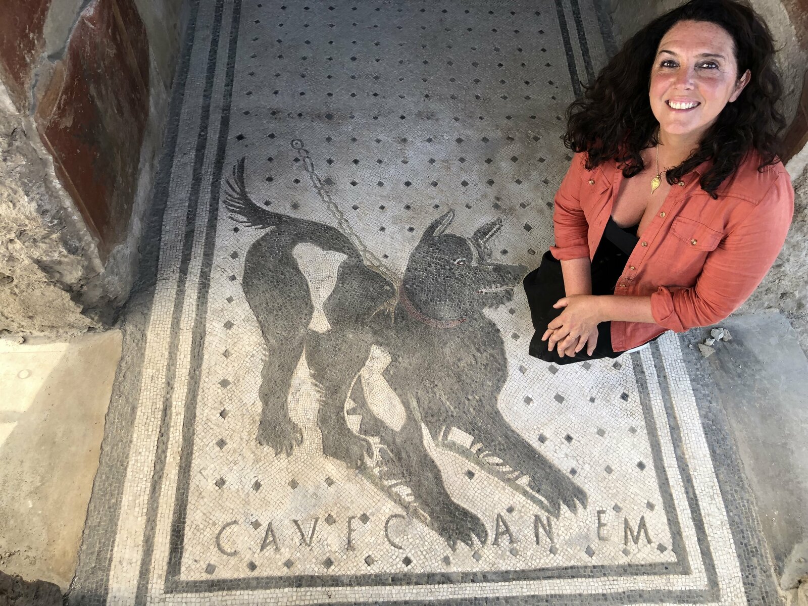Die Mumie des TutanchamunBettany Hughes with Cave Canem Mosaic. (Sandstone Global)Bild: © Sandstone Global