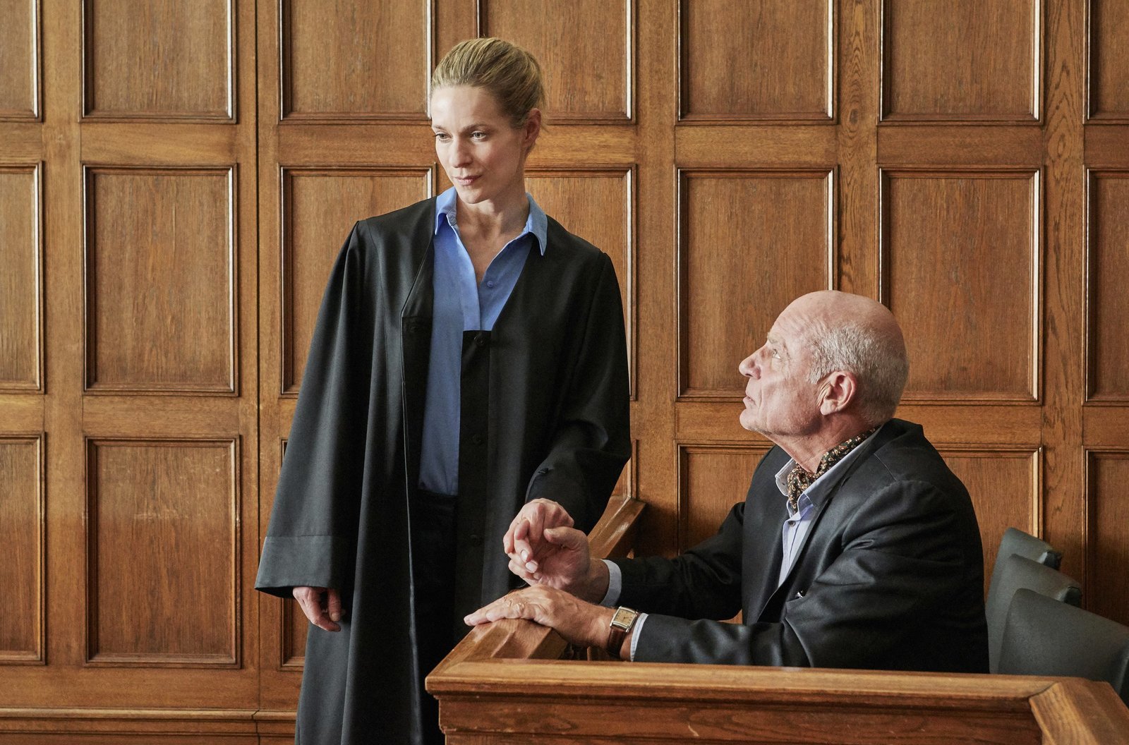 Gefahr im VerzugPaul Heiland (Rüdiger Kuhlbrodt, r.) spendet seiner Tochter Romy Heiland (Lisa Martinek, l.) bei der Gerichtsverhandlung moralischen Beistand.Bild: © c ARD/Reiner Bajo