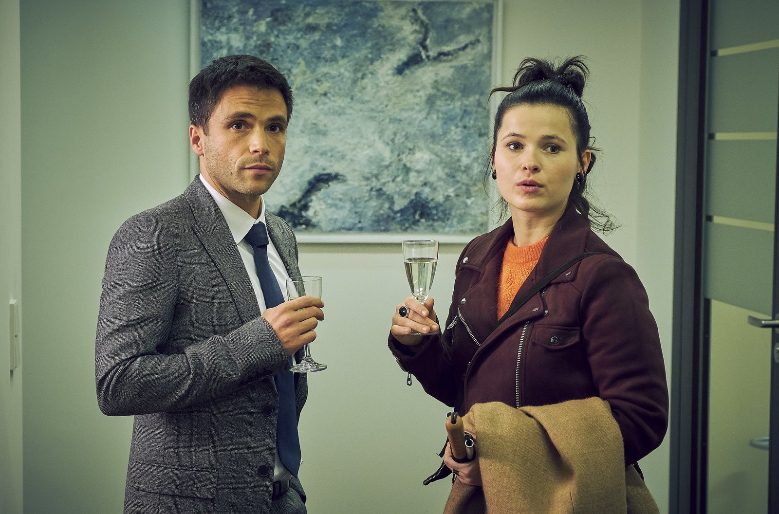 Tödliche TropfenBen Ritter (Peter Fieseler, l.) und Staatsanwältin Johanna Knabe (Helene Grass, r.) beobachten Romys Zusammenstoß mit einem Kellner.Bild: © c ARD/Gordon Muehle