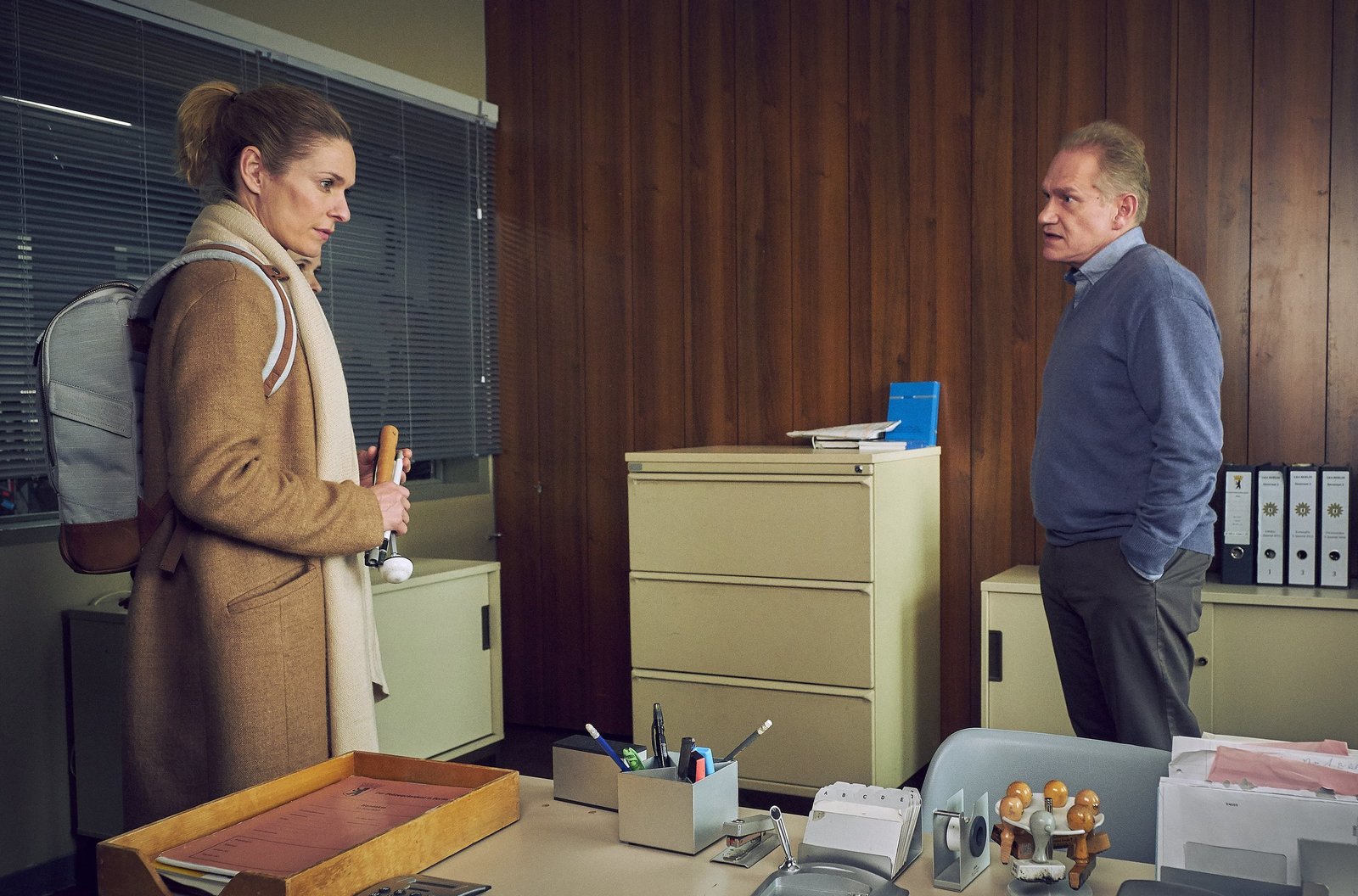 Wenn Du mich liebstRomy Heiland (Lisa Martinek, l.) befragt den Zeugen Klaus Brandner (Joachim Paul Assboeck, r.).Bild: © ARD/Gordon Muehle