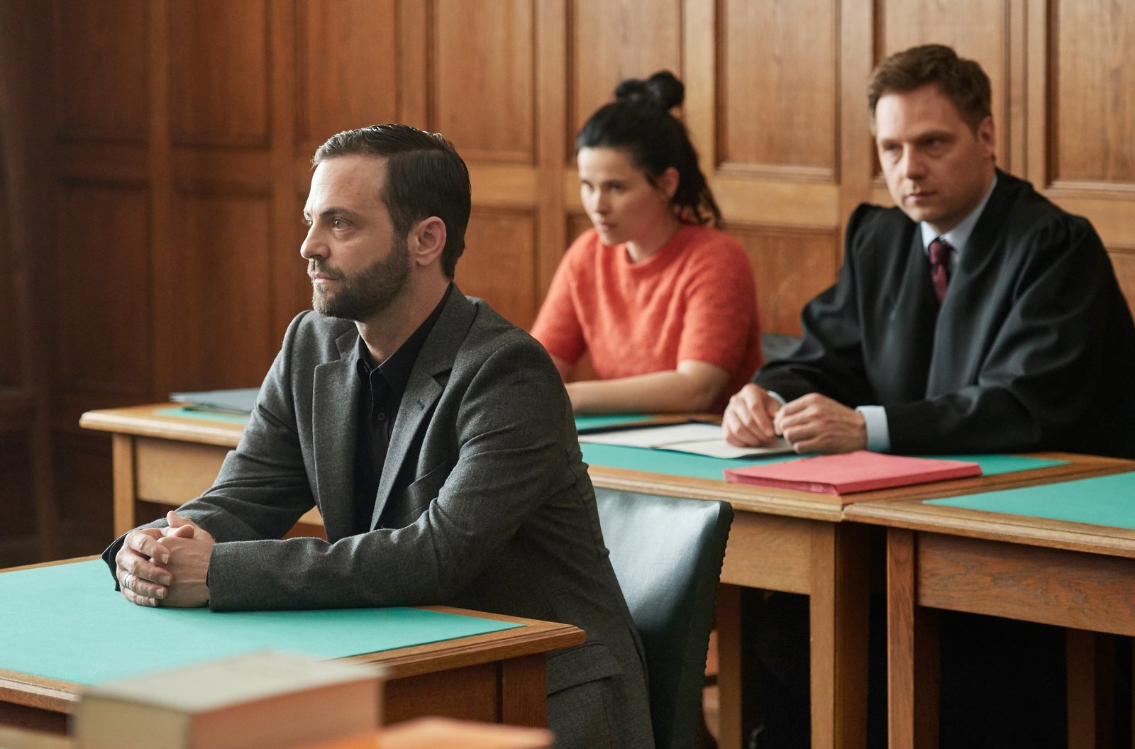 Gefahr im VerzugVor Gericht: Max Baerfeld (Christoph Letkowski, r.) hat die Verteidigung von Ada Holländer (Anna Fischer, l.) gegen hren Ex-Freund André Schulz (Aleksandar Tesla, l.) übernommen.Bild: © c ARD/Reiner Bajo