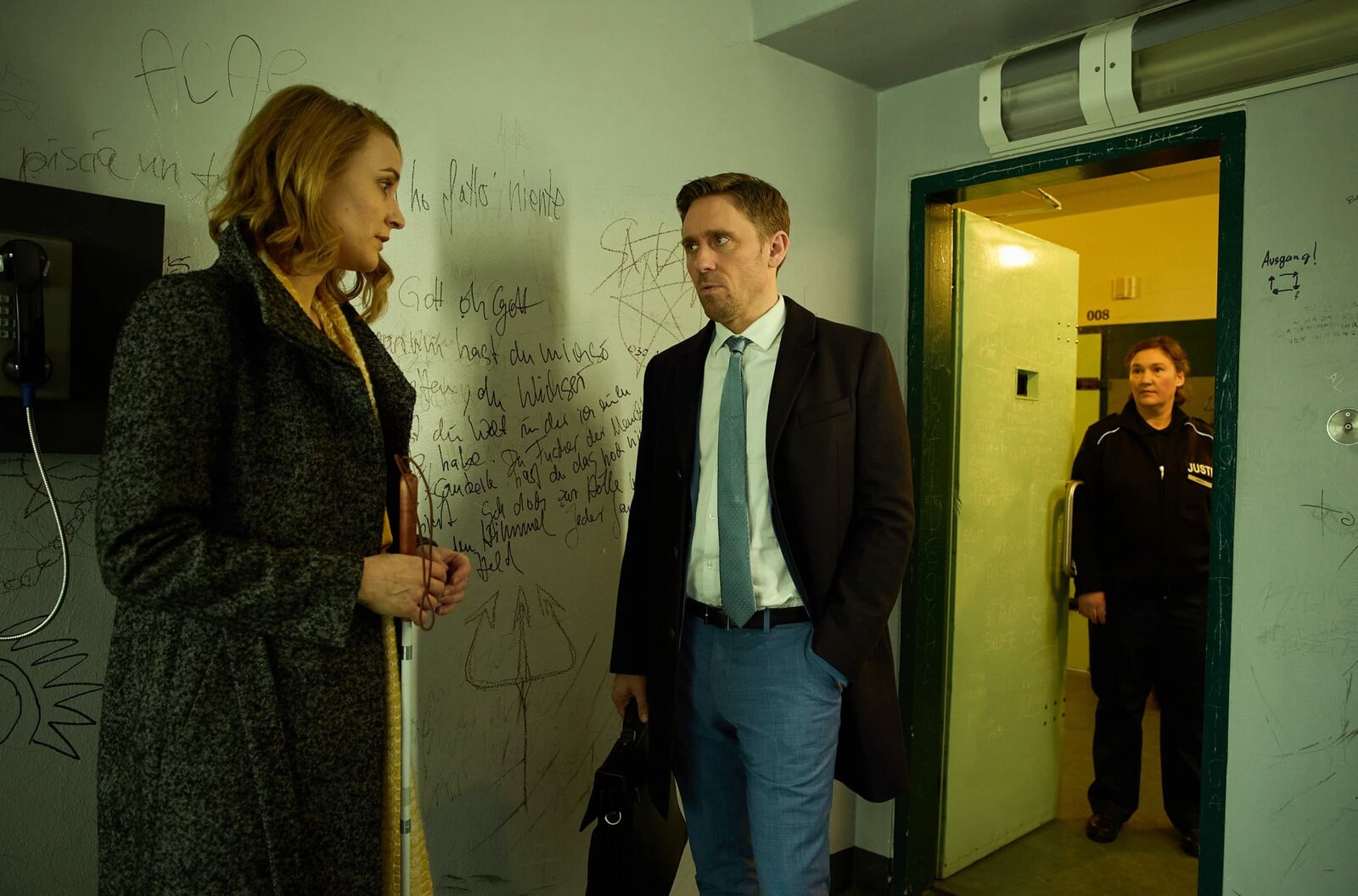48 StundenNach ihrer Verhaftung darf Romy Heiland (Christina Athenstädt, l.) unter Aufsicht der Justizbeamtin Silvia Pötsche (Katja Marie Luxemburg, r.) Ben Ritter (Peter Fieseler, M.) treffen, der sie als Anwalt vertritt.Bild: © ARD/Rudolf Wernicke
